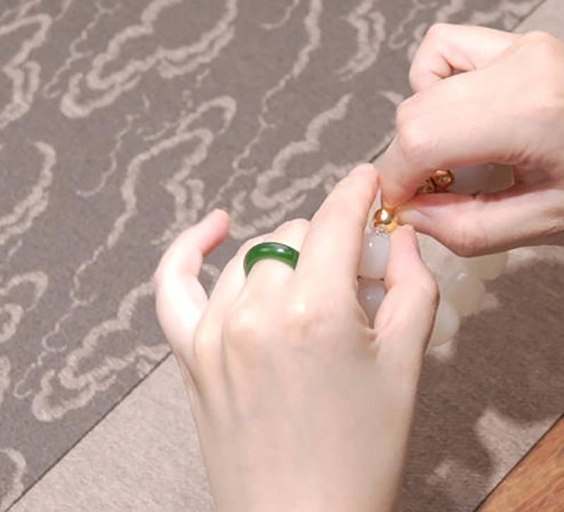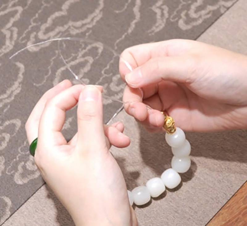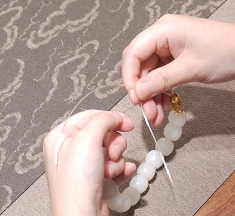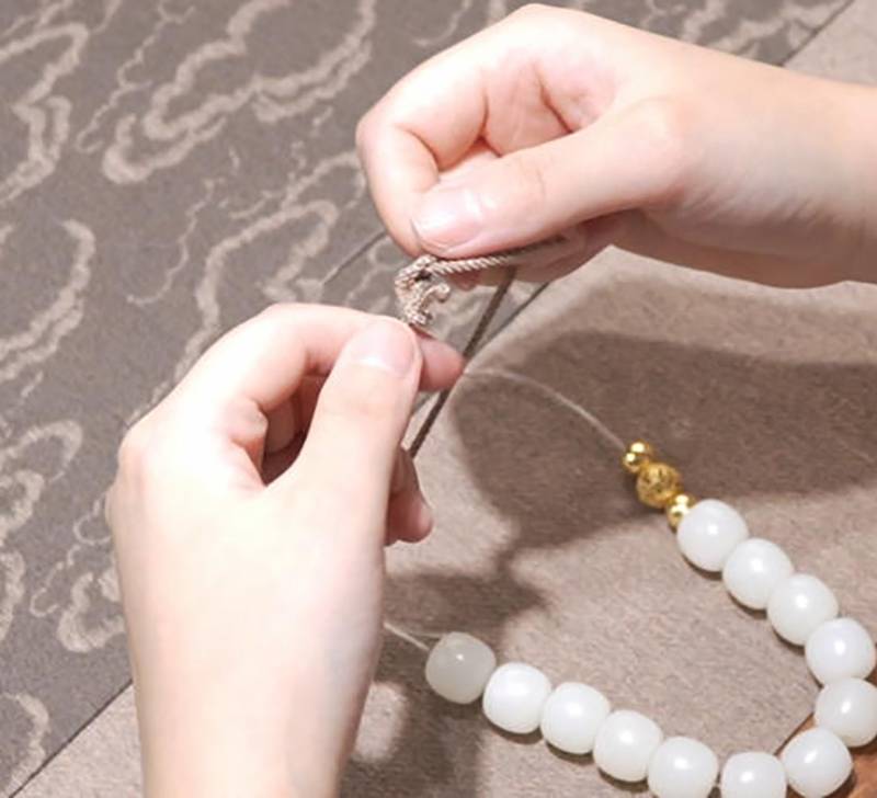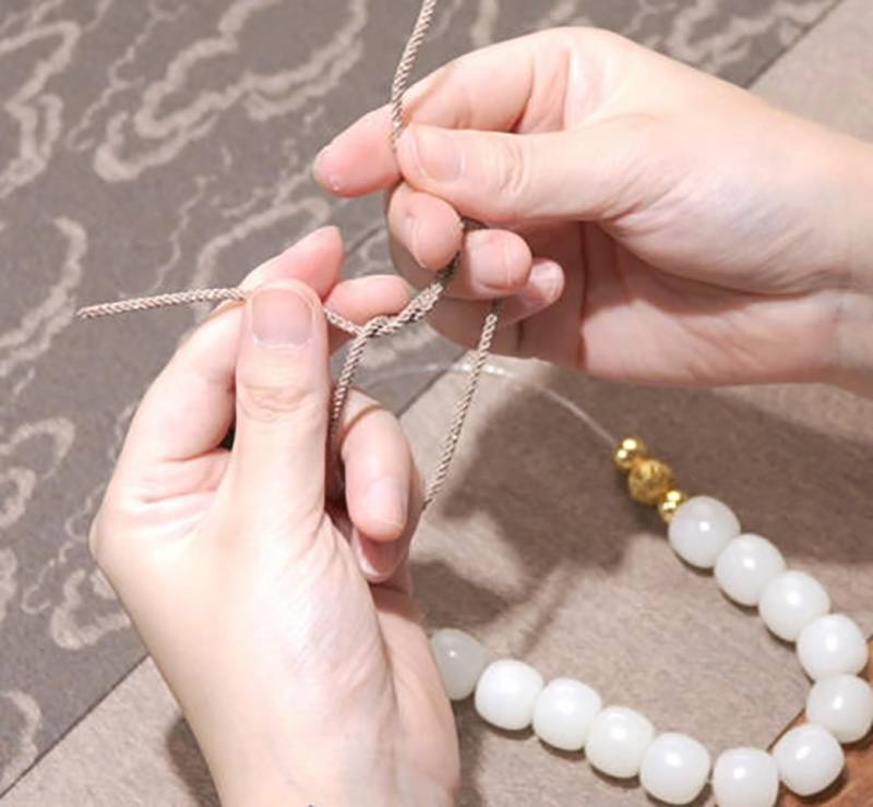 怎么样,这个打结方法是不是超简单?按照 “左压右、绕两圈、两次收紧” 的步骤,几分钟就能搞定,最后把绳结藏进孔洞里,手串看起来还特别精致!