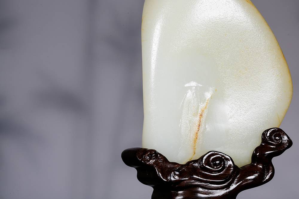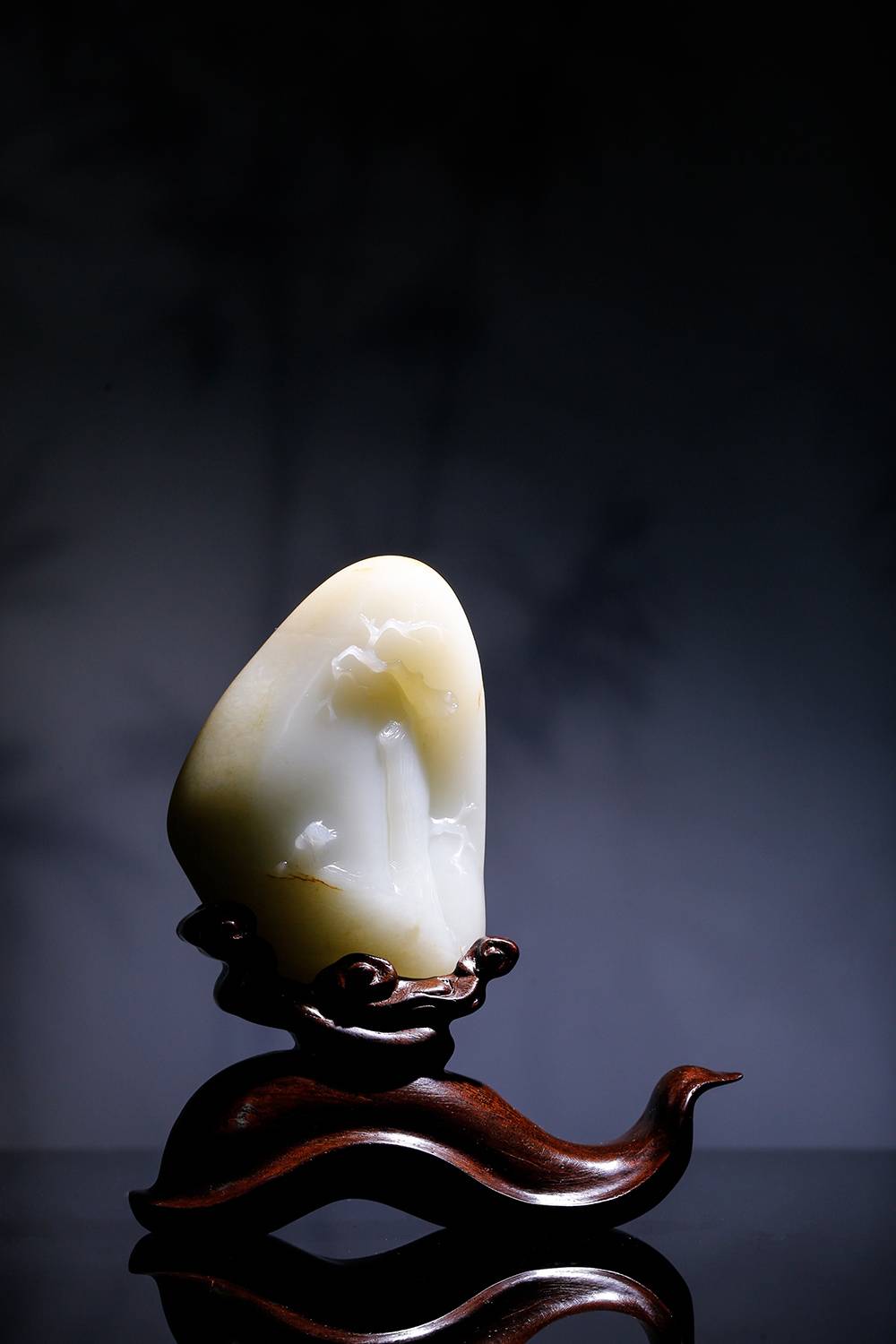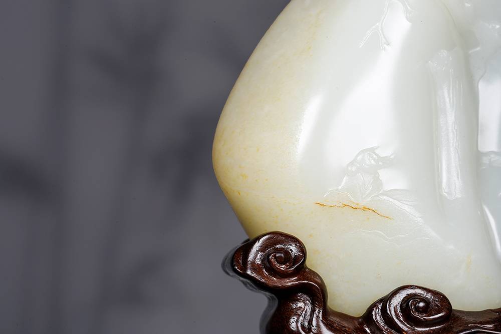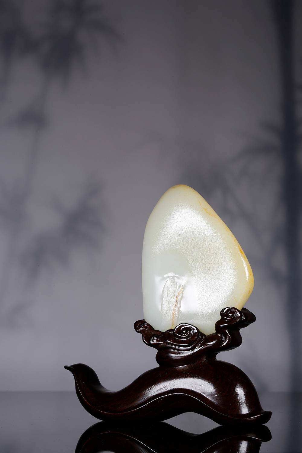 这件作品以顶级新疆和田籽料琢成。玉质醇熟,白润中透出内敛的脂光。天然皮色宛如写意水墨,而两道醒目的绺线,则如同玉料自身的独特语言,静候着能与它对话的知音。