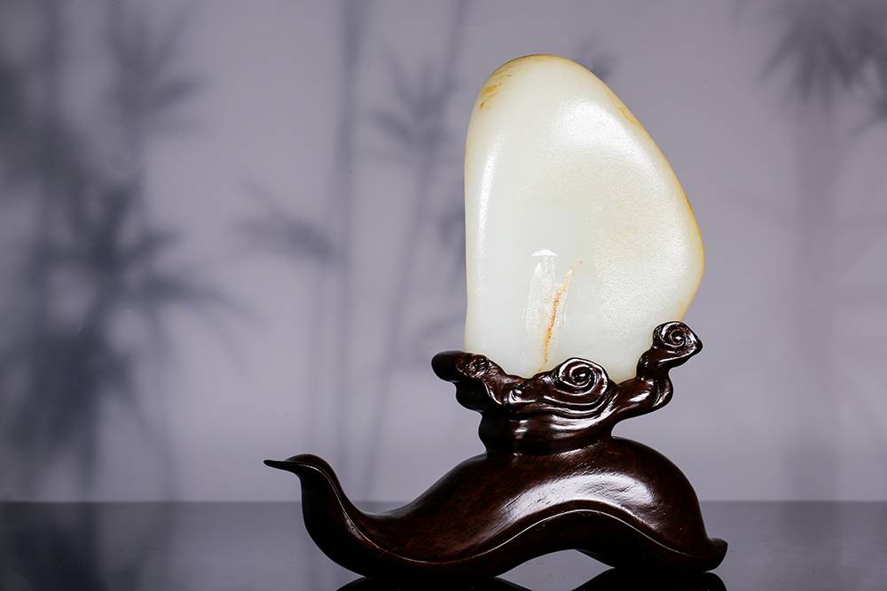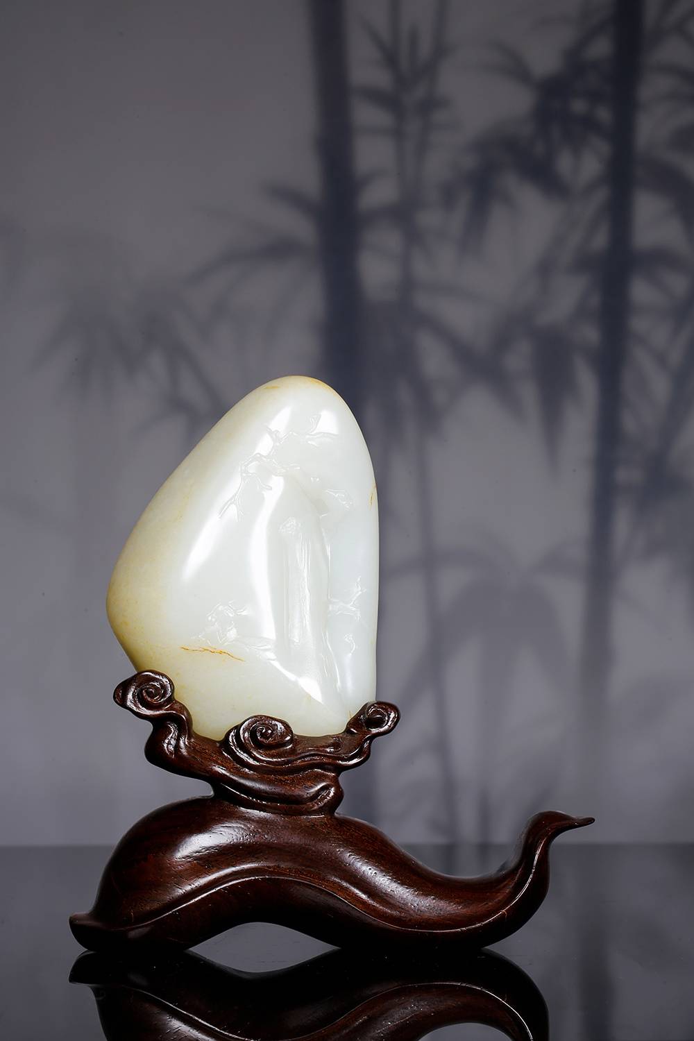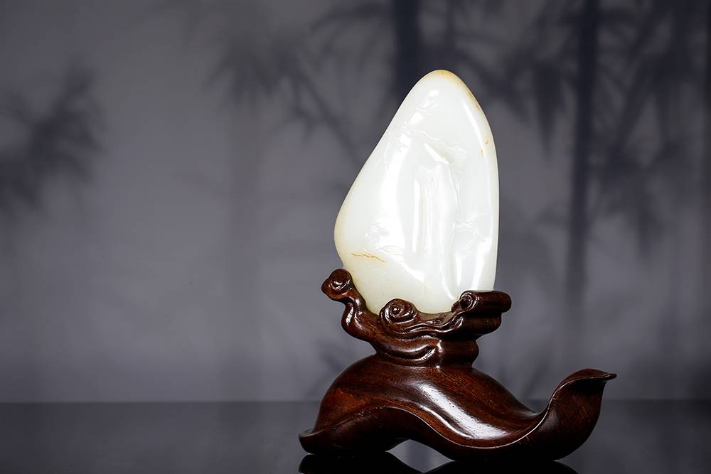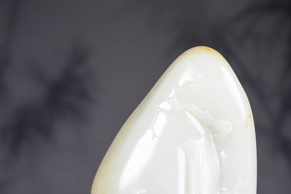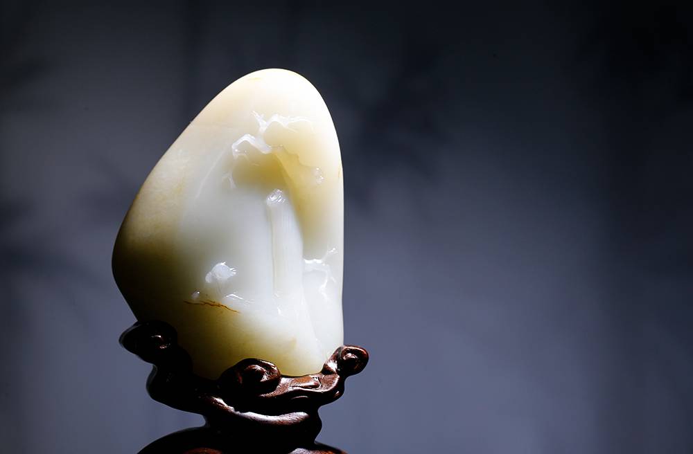 这件作品以顶级新疆和田籽料琢成。玉质醇熟,白润中透出内敛的脂光。天然皮色宛如写意水墨,而两道醒目的绺线,则如同玉料自身的独特语言,静候着能与它对话的知音。