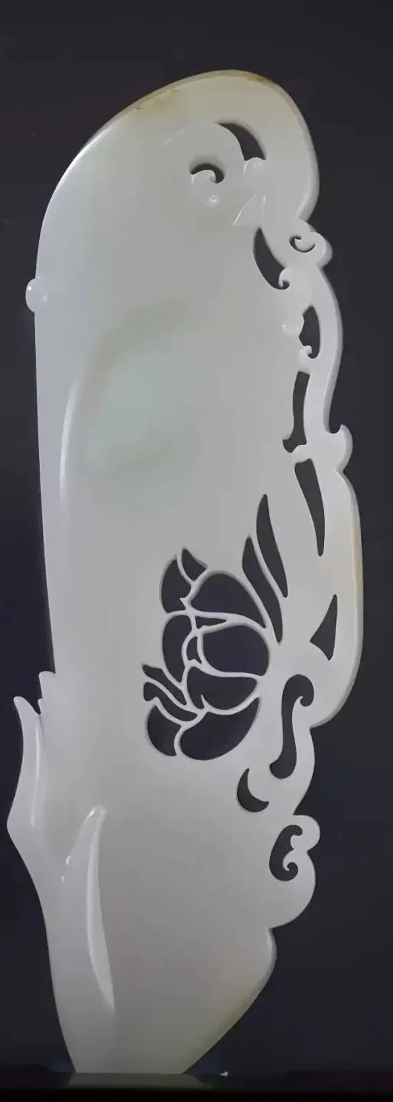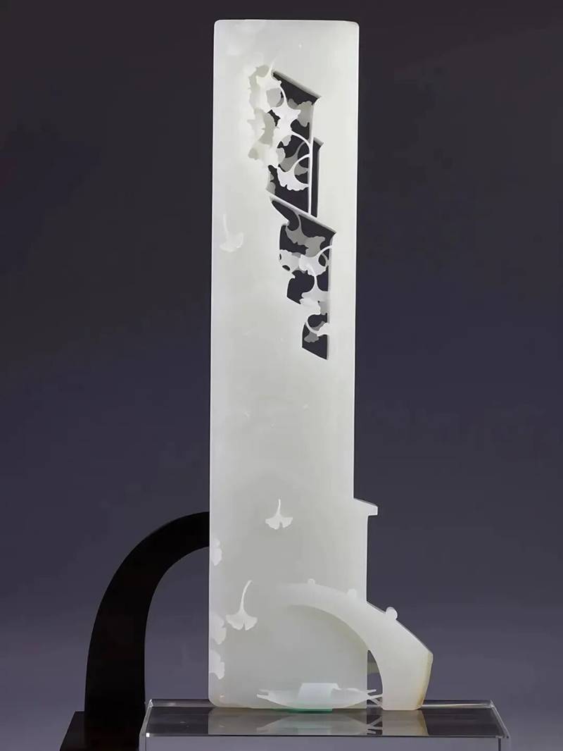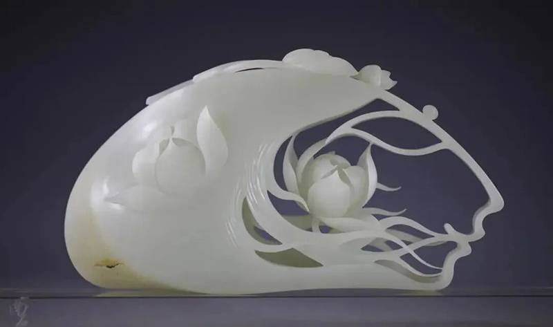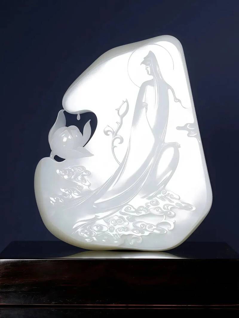 于是,我们看见一幅行走于云水之间的水墨诗卷——仙人长身玉立,衣袂翩然,荷花傍身而生;镂空雕琢的枝蔓纹路如笔触般轻盈舒展。我们也看见白玉青蛙,憨态可掬,浑圆可爱。
