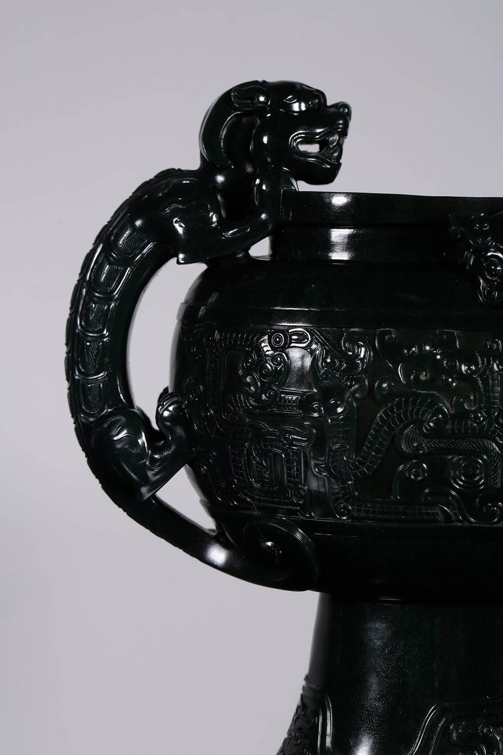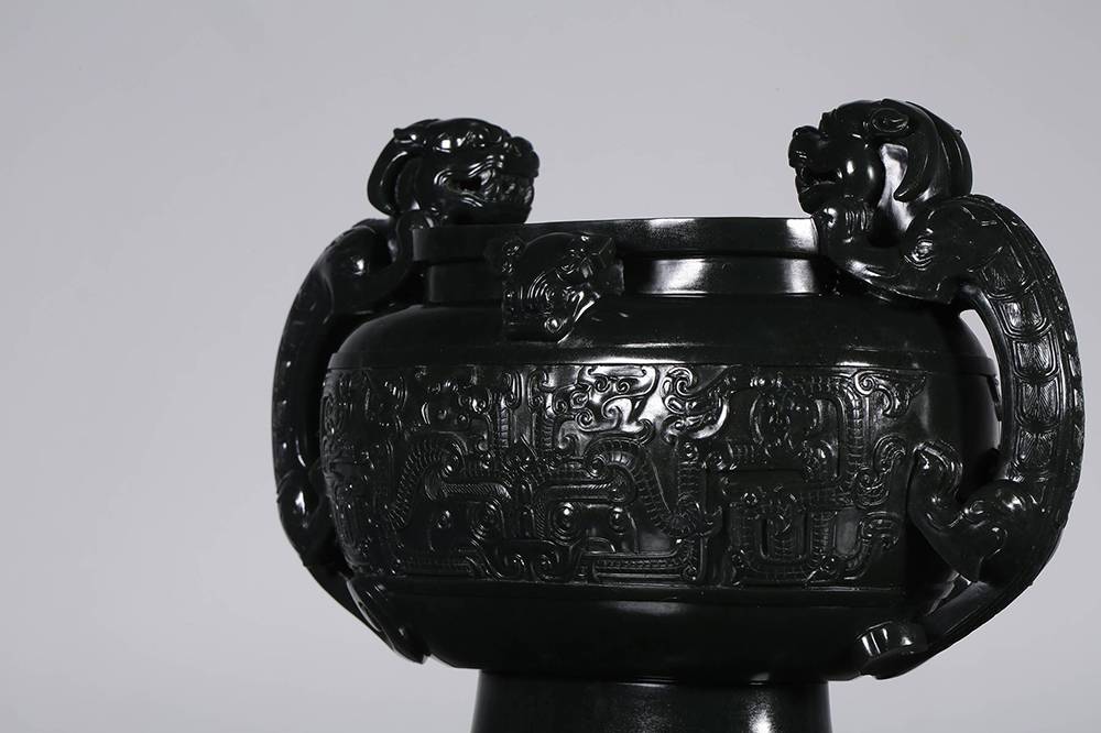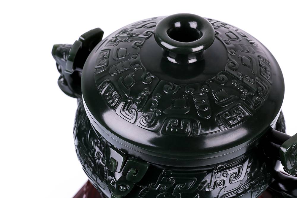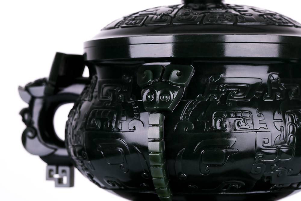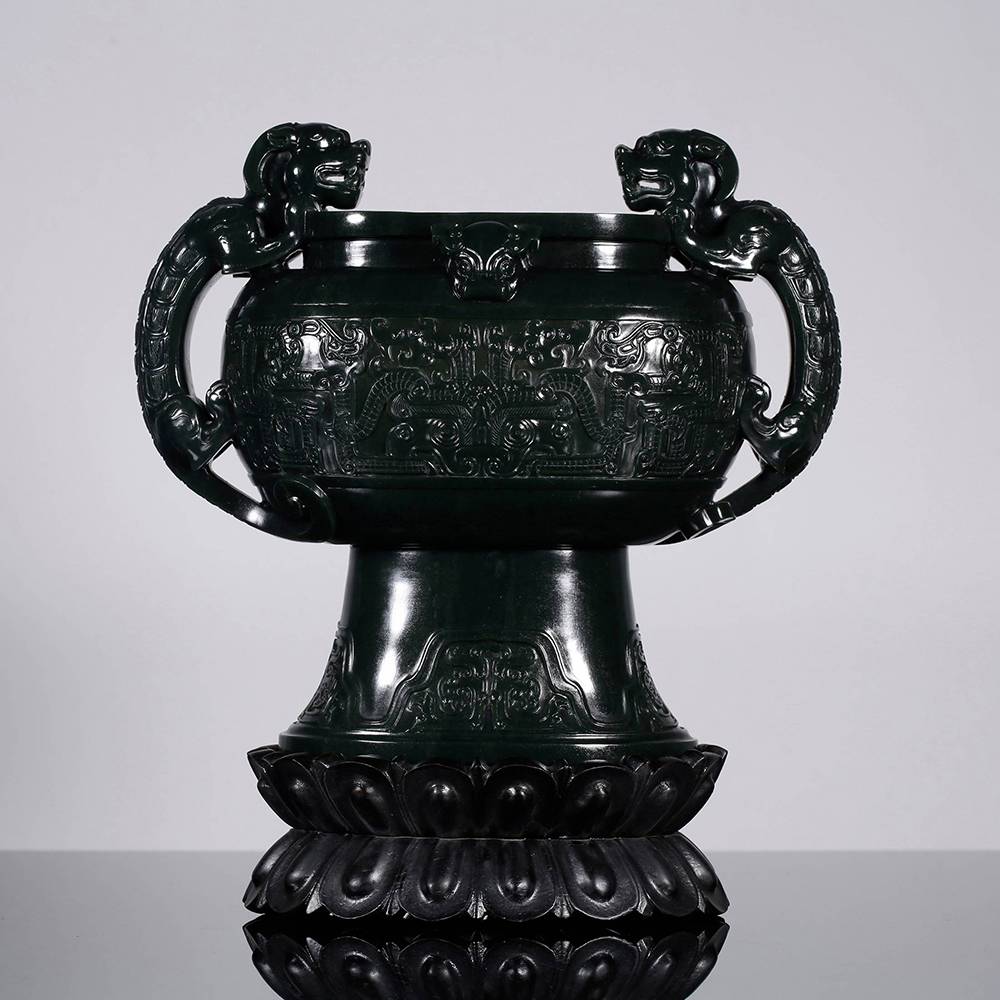 塔青幽黑,细糯油润,贵气自成,器型取古,薄胎巧作,掏膛均匀,鼓腹束腰,莲座承之,端庄典雅,壶腹满工雕仿古纹饰纹,牛角兽面纹皆入玉三分,双龙耳尤为绝妙,昂首盘身,鳞爪欲动,工艺考究且精湛,整器以玉承礼,玉色肃穆,刀法古拙,于今能见此大料精工、形神兼备之作,实属难得,可陈可藏,气韵长存。