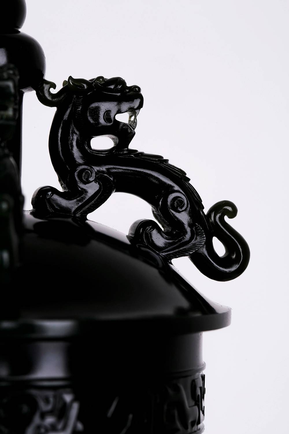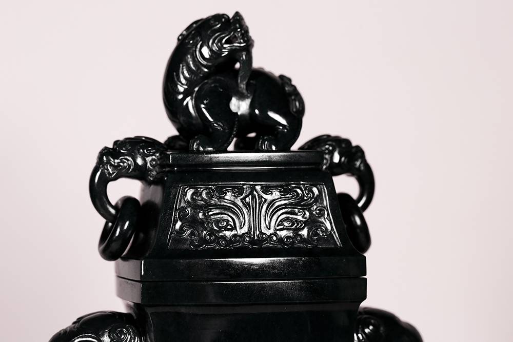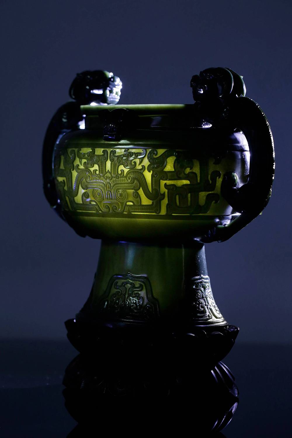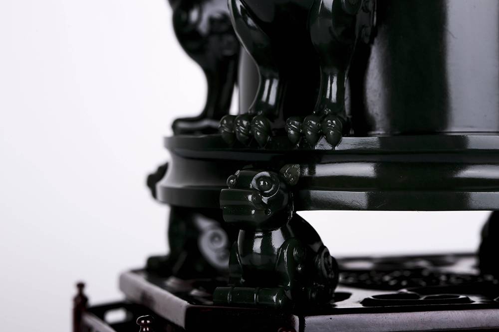 塔青幽黑,细糯油润,贵气自成,器型取古,薄胎巧作,掏膛均匀,鼓腹束腰,莲座承之,端庄典雅,壶腹满工雕仿古纹饰纹,牛角兽面纹皆入玉三分,双龙耳尤为绝妙,昂首盘身,鳞爪欲动,工艺考究且精湛,整器以玉承礼,玉色肃穆,刀法古拙,于今能见此大料精工、形神兼备之作,实属难得,可陈可藏,气韵长存。