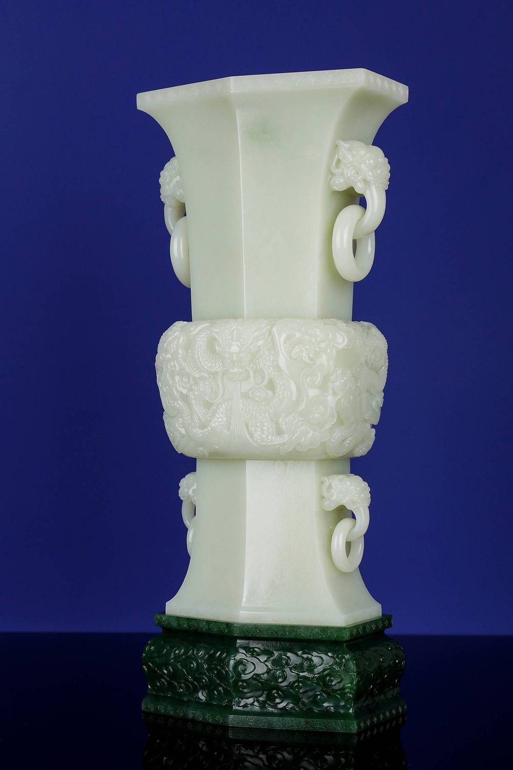 料子上乘,形制难得,作者取清代花觚之雅,融商周礼器之厚,身浮雕游龙穿云,鳞甲毕现;四龙首衔活环,尤见古工之妙,配新疆玛纳斯碧玉祥云座,更托气质;工料双绝,且能贯通古今,古韵再现,龙形有神,置于案头,既显清贵,亦载吉意。