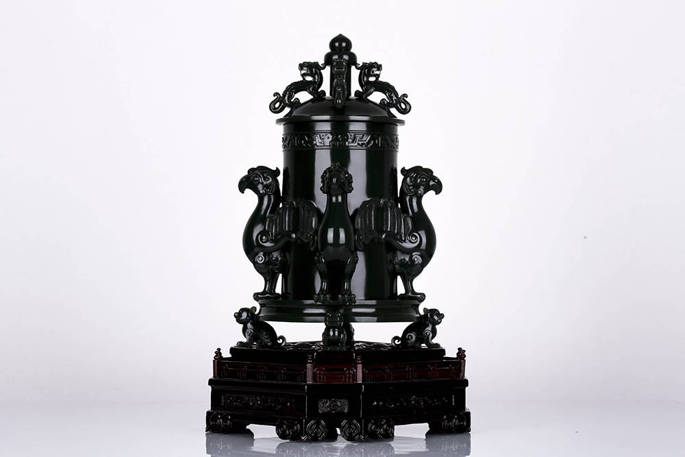 青玉仿商周礼器,形制端庄,将青铜之重化入玉之温润。浮雕仿古纹饰点缀,展翼凤鸟环绕而立,顶部螭龙呼应,立体生动,工料俱精,整器气韵沉稳,有“与古为邻”之厚重,亦不失现代审美调性,今人置于案头,不显突兀,反生静气,是一件能从容走进日常的收藏重器。