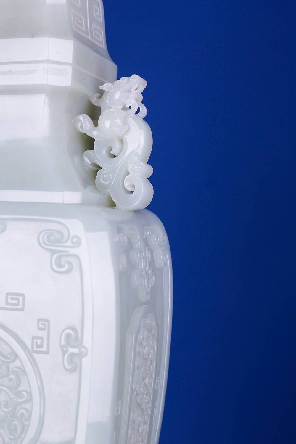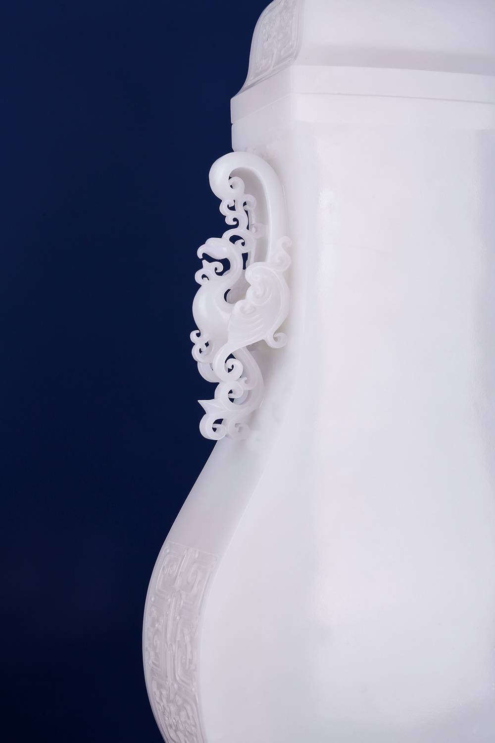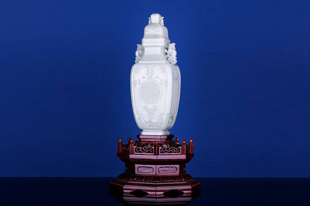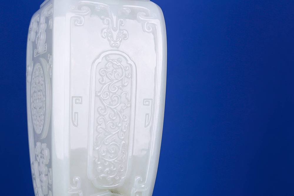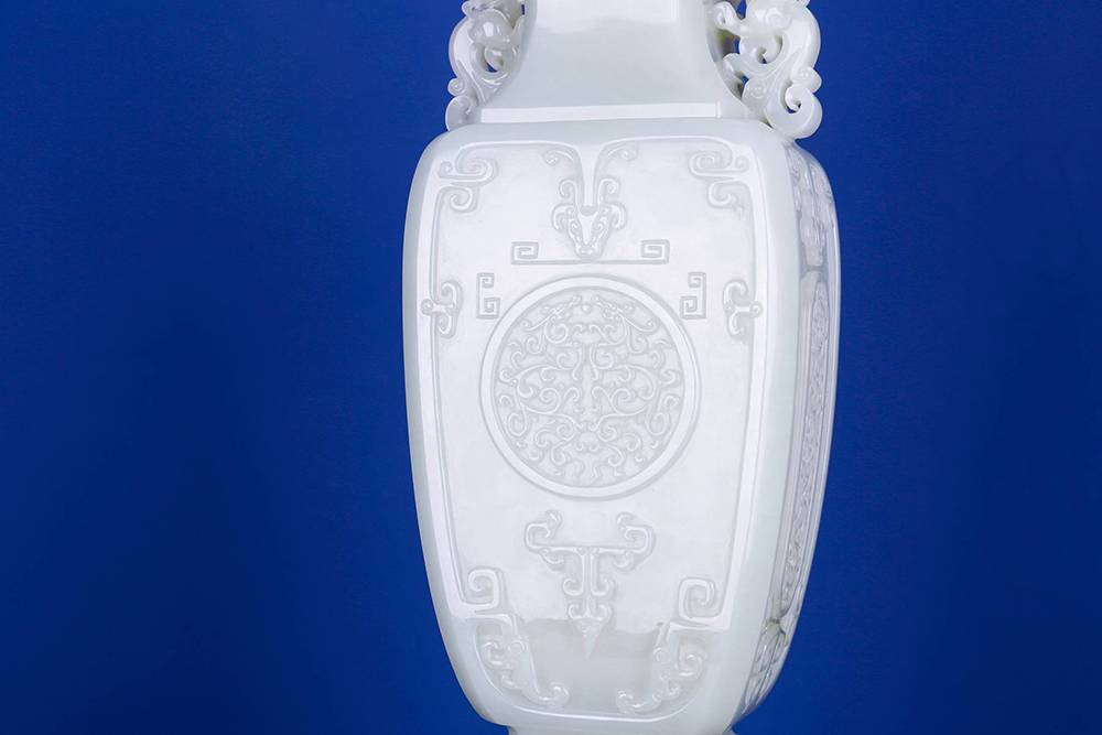 以玉质上乘的和田玉为材,巧琢规整大气的方瓶,料子熟糯,八角盖配回纹,古意扑面,两侧立体圆雕龙耳,线条流畅,造型卷曲生动;瓶身浮雕仿古纹,比例把控到位,线条干净利落,整器工艺考究,细观可见良工之思,是以今器承古韵,心手相应。玉性温润,器韵端庄,陈于案头,可澄心境,一方玉瓶,一段清赏之缘,藏玉至此,可悟传承。