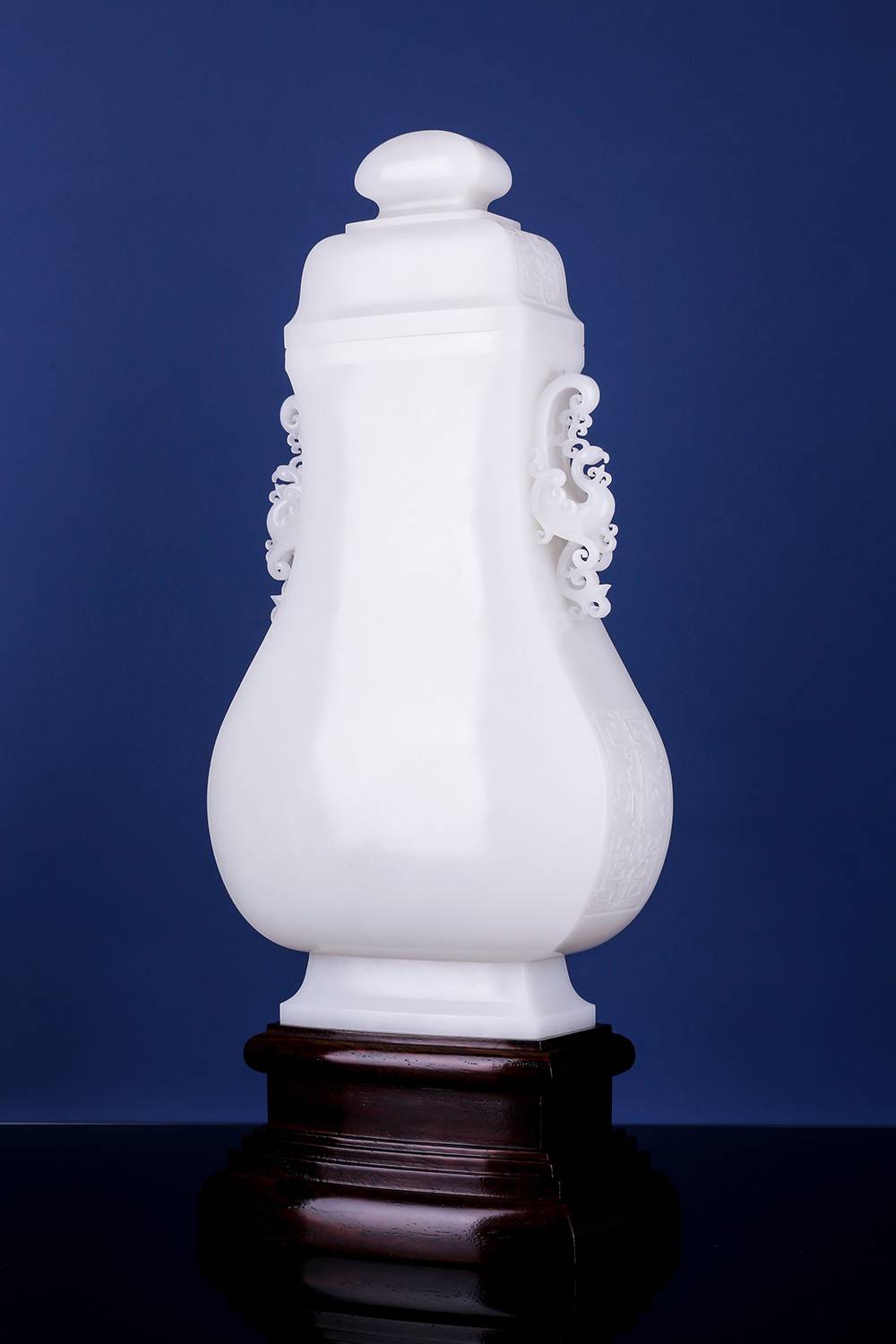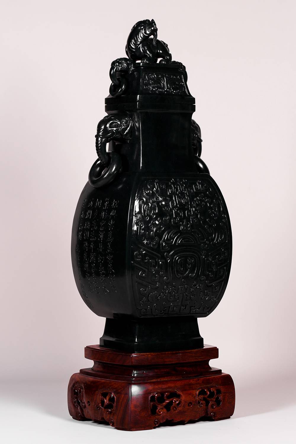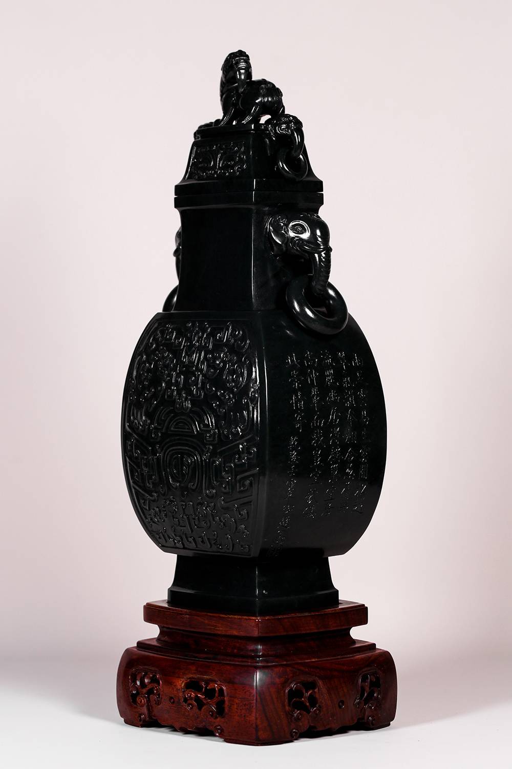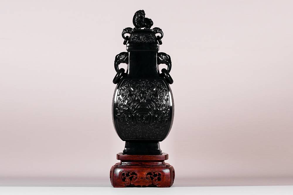 此件仿古方瓶,形正气沉,满工浮雕古纹环绕寿字,线条深峻,筋骨分明,寓意长寿圆满。象耳衔环,细节精到;盖顶瑞兽踞守,更添威仪。