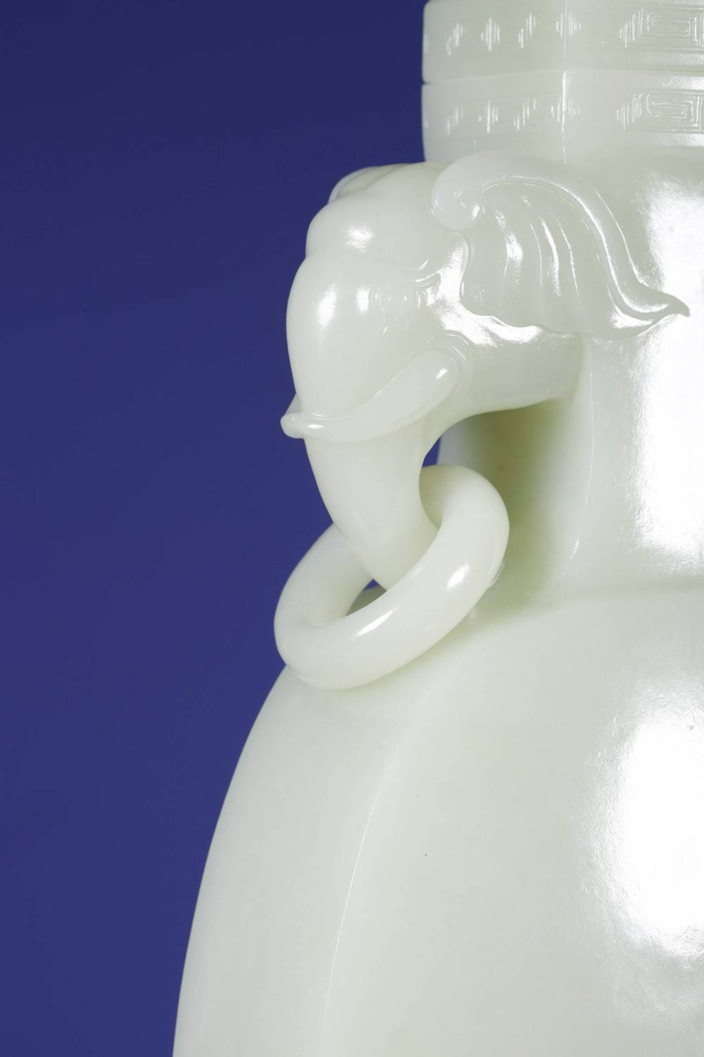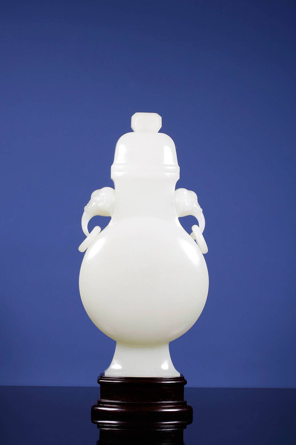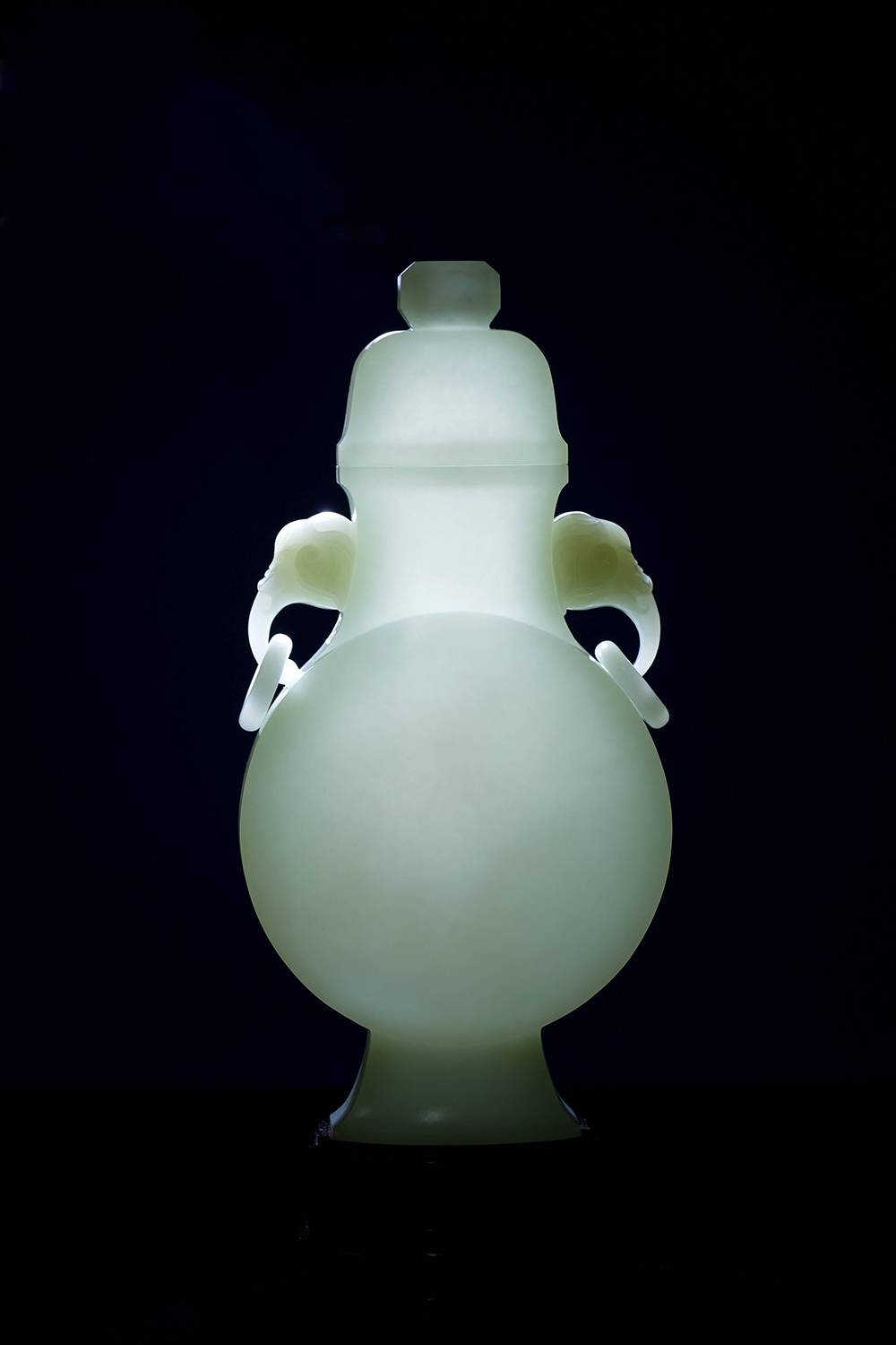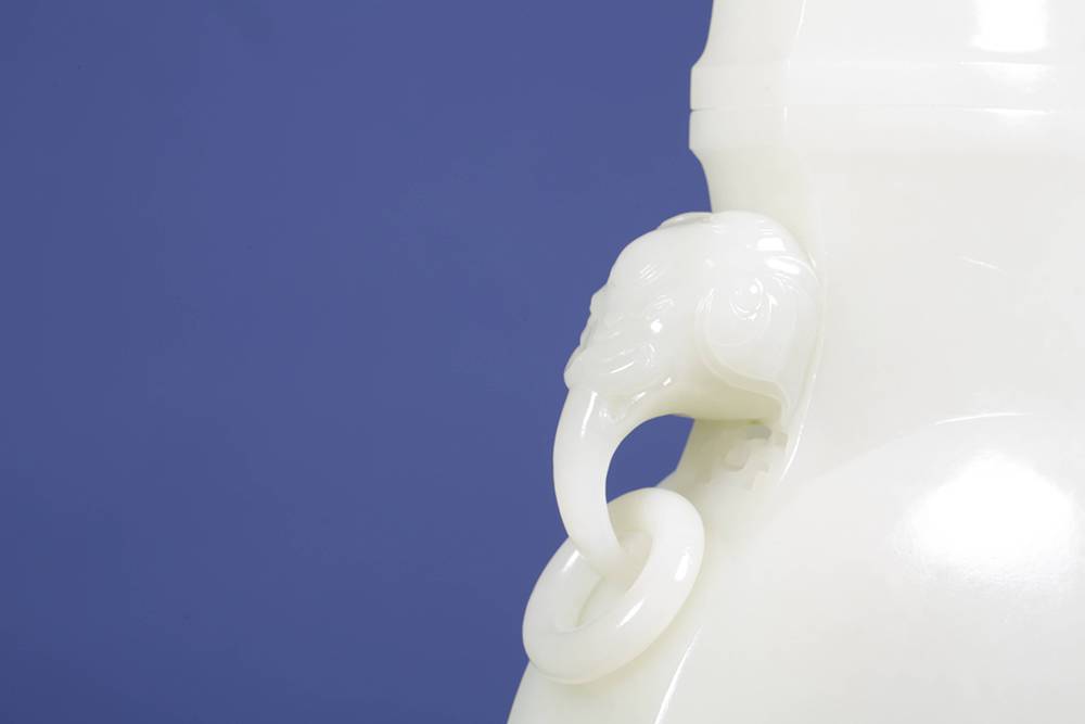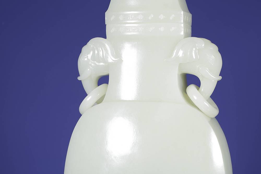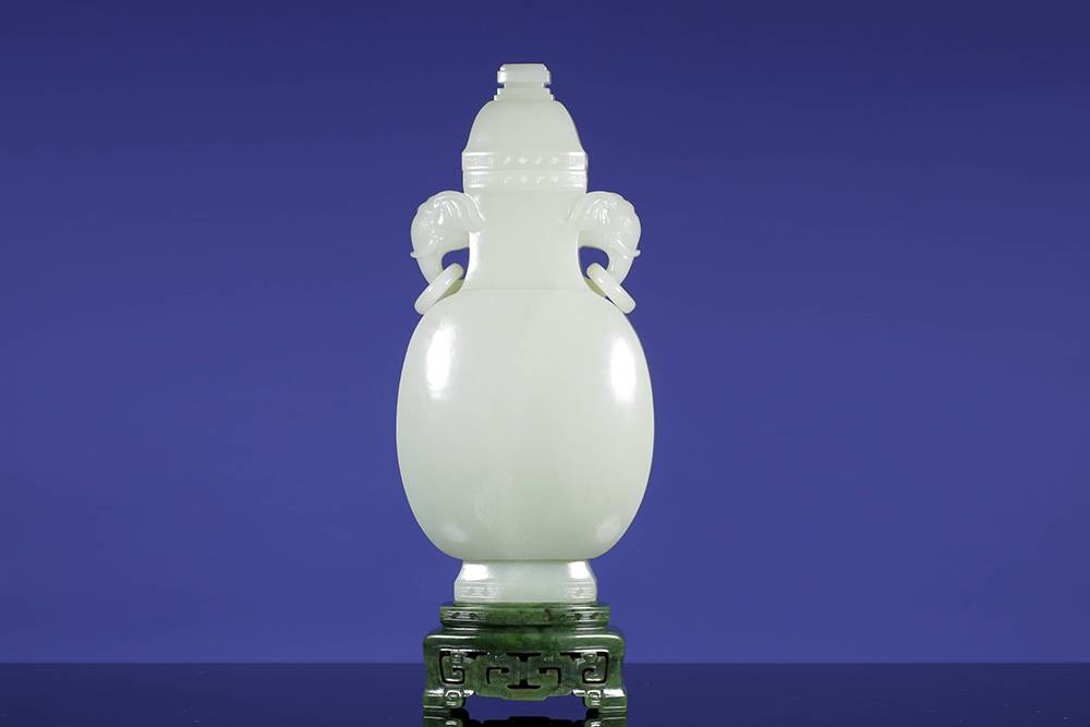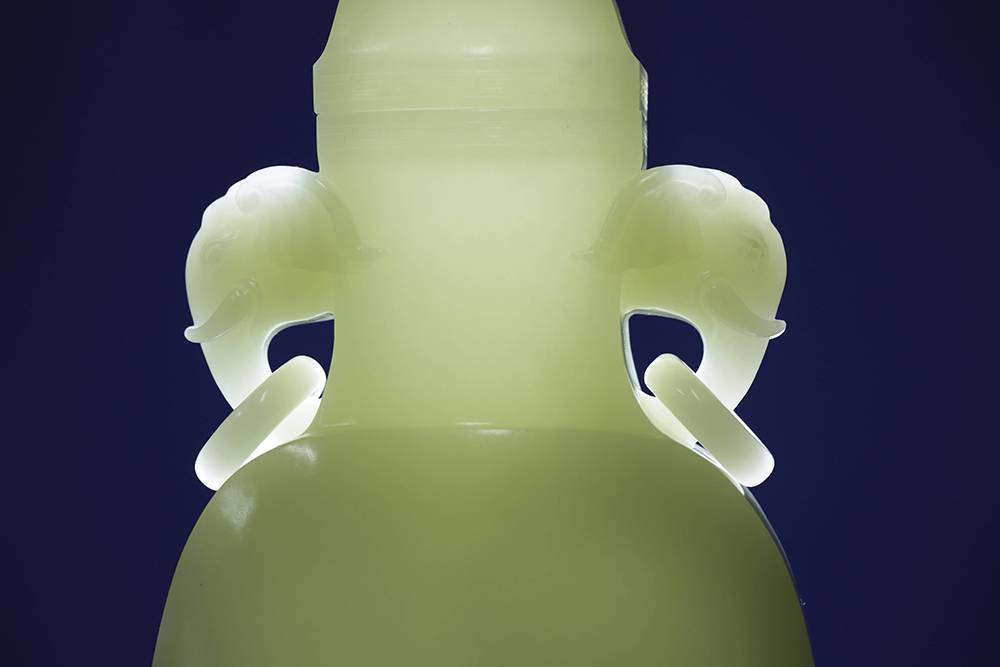 重量近三公斤玉瓶,料子熟润如脂,器型光素,圆润饱满,取古制而气象端庄,点睛之笔在两处:一为象耳活环,由整料雕出,象鼻卷曲自然,环转自如,最见功力;下配碧玉底座,与玉瓶相映,古雅顿生,料、工、型俱臻上乘,大器能工,沉静有韵,可作案头清供,亦堪传世收藏。