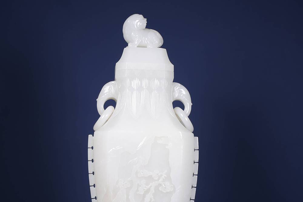 八棱白玉瓶,形正韵古,立体圆雕融合活环工艺,巧作双象耳衔活环,盖钮踞兽,皆生动见功;瓶身浮雕山水人物,疏密有致,意境清远;瓶身起扉棱,一气呵成,增强作品的立体感。整器工不掩质,雕琢精到而玉润犹存,料、工、韵三者俱佳,是文房清供上品,可陈可藏。