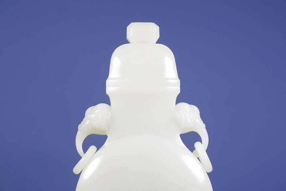 白玉抱月瓶,取明清形制,圆腹如月,气象雍容,以立体圆雕、活环等多元玉艺,巧琢双象耳衔活环,从整料中雕出,浑然一体,掏膛均匀,料子显凝脂光,器型依旧挺括,最难的就是这份均衡。整件作品,料温润,工精到,型典雅,象耳活环更见匠心,是形正、工稳、料熟的可传佳品。