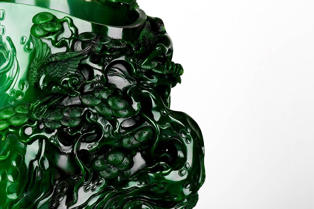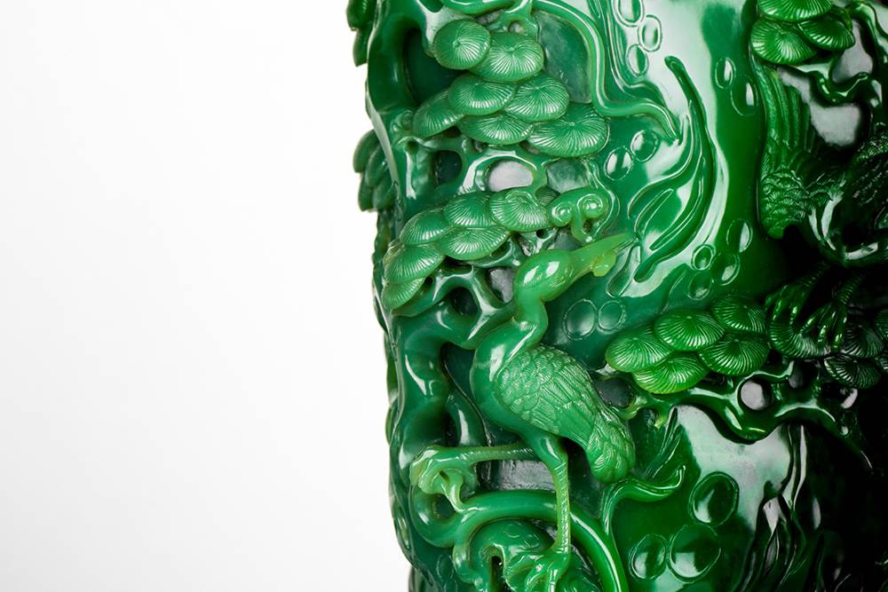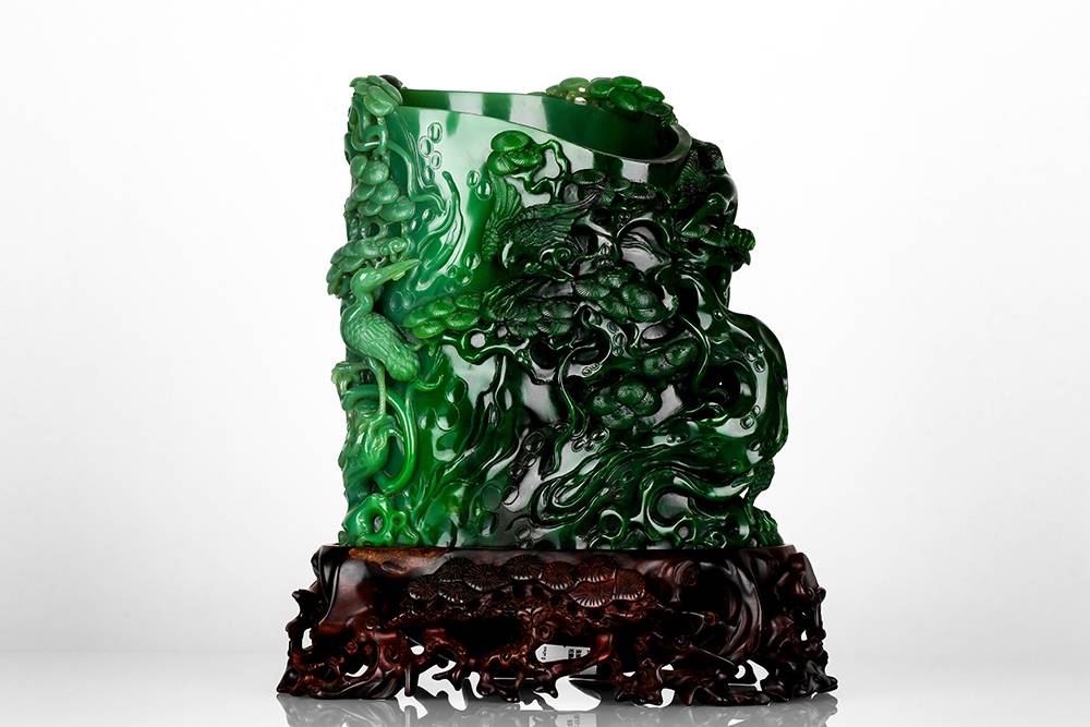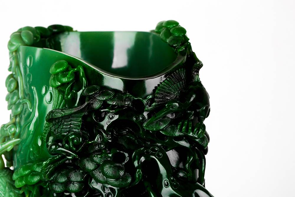 随型依韵,俏聚色而琢,此件碧玉笔筒,玉色由浓绿渐次铺染,质地凝缜,以圆雕、浮雕诸法,琢松鹤延年:松干遒劲,松针层叠;仙鹤或衔如意,或振羽回旋,姿态生动。画面疏密有韵,留白见呼吸,光影流转间,尽显意境空灵。