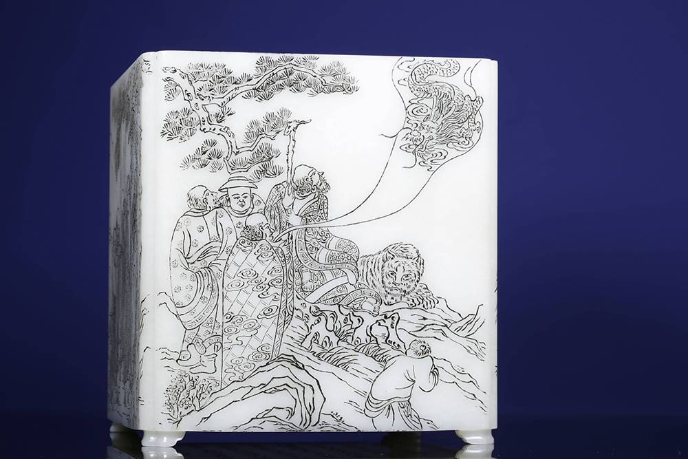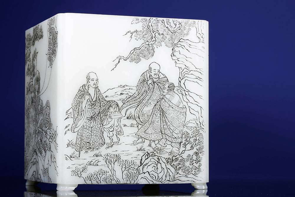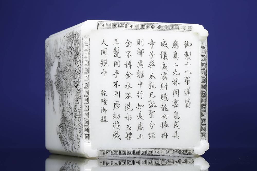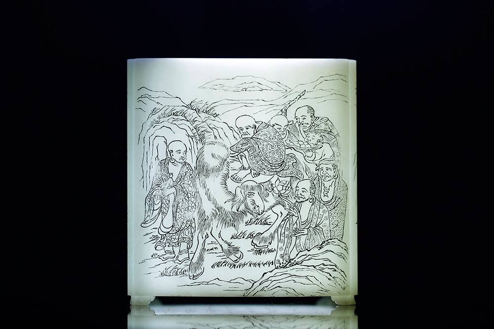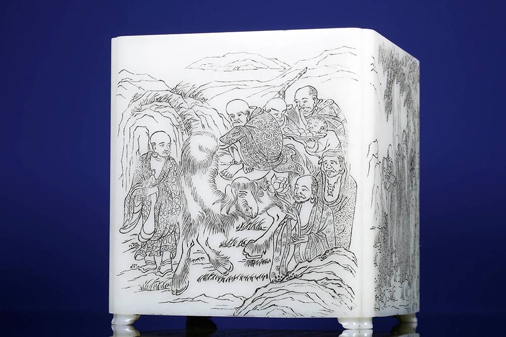如今市面上难得一见的公斤级白玉笔筒,器型方方正正、规规矩矩,藏着几分文气与傲骨,料子白细,作者以玉为帛,运刀如笔,四面筒壁阴刻十八罗汉,神态栩栩,四面各呈一个经典故事,面面相合,情境感拉满。