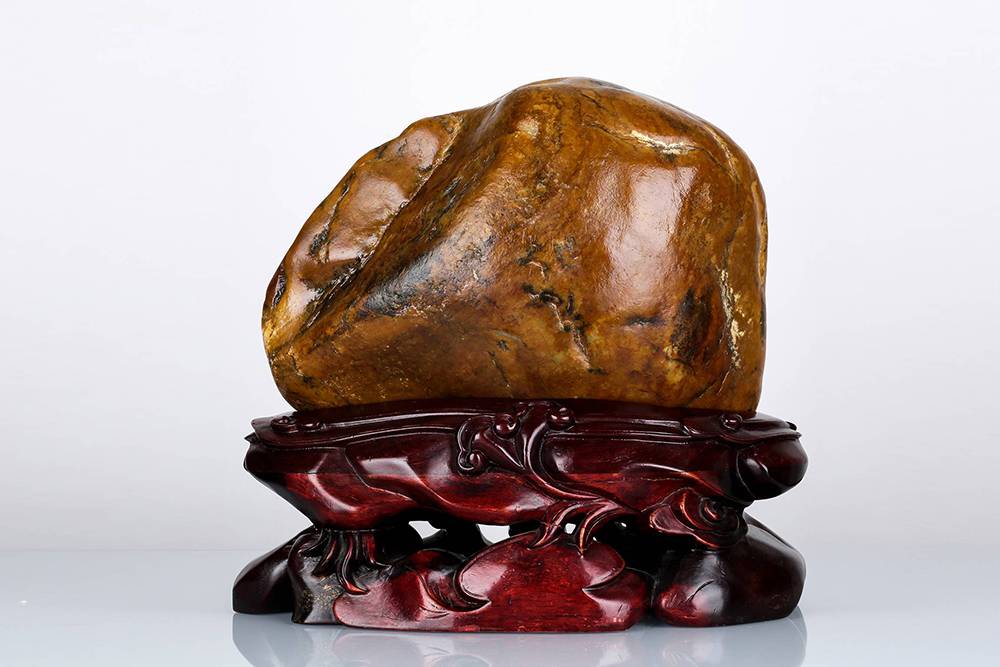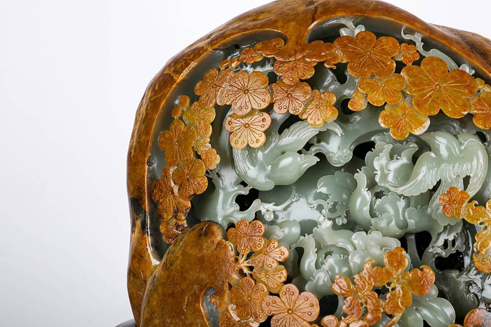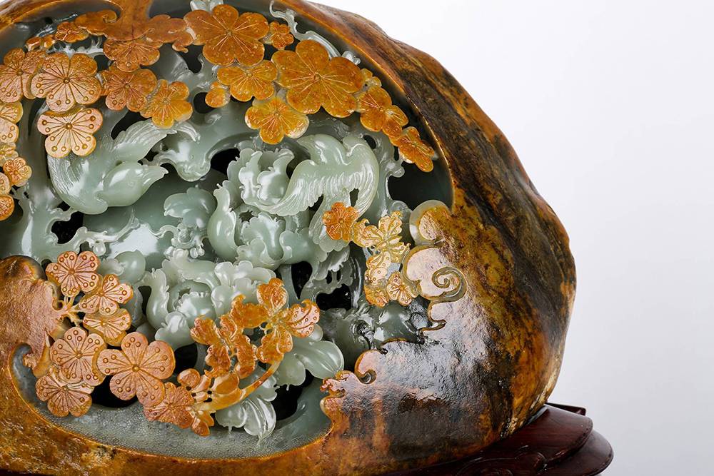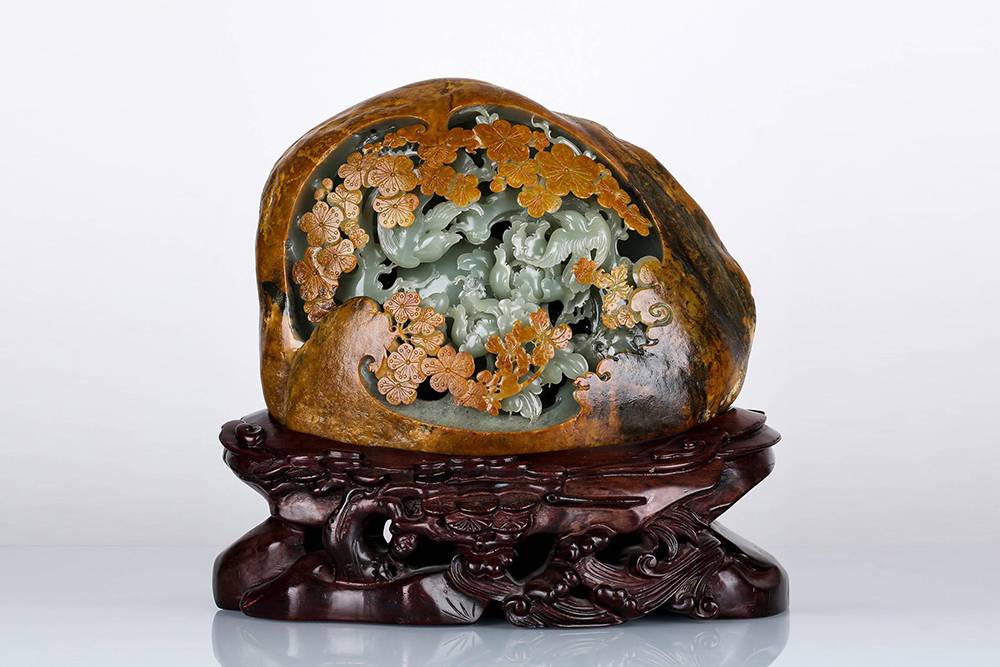 和田籽料近乎满皮,俏色用得妙,外留褐皮为壳,内里透雕花开富贵之境——牡丹雍容,梅点金黄,灵鸟相映,镂空见功底;红木座一托,更显玉之温润。是谓“借天工,应人心”,皮色是造化,雕琢显匠心,牡丹富贵,梅花清雅,籽料特质与吉祥寓意浑然一体,方寸之中,可赏天然风韵,可观人工之精湛,韵味足。