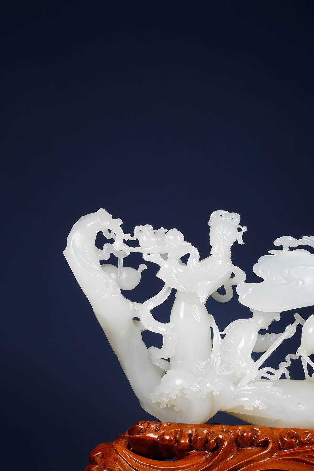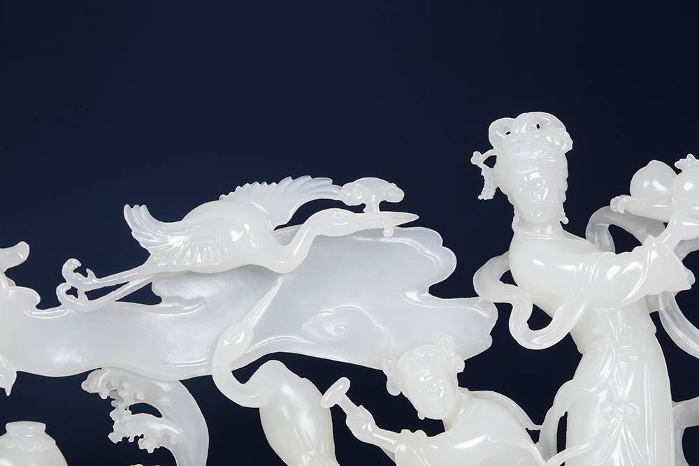 此作妙在“以刀破玉”,通体镂空而气韵不绝,白玉温润,麻姑衣袂流转,仙鹤童子相随,密处透灵,工极而意远,作者运刀如笔,刻出了仙家的飘逸,更让玉有了呼吸,立体镂空技艺,吃料耗工,此件工意双全,传统题材透出现代生机,是藏工藏韵的雅物。