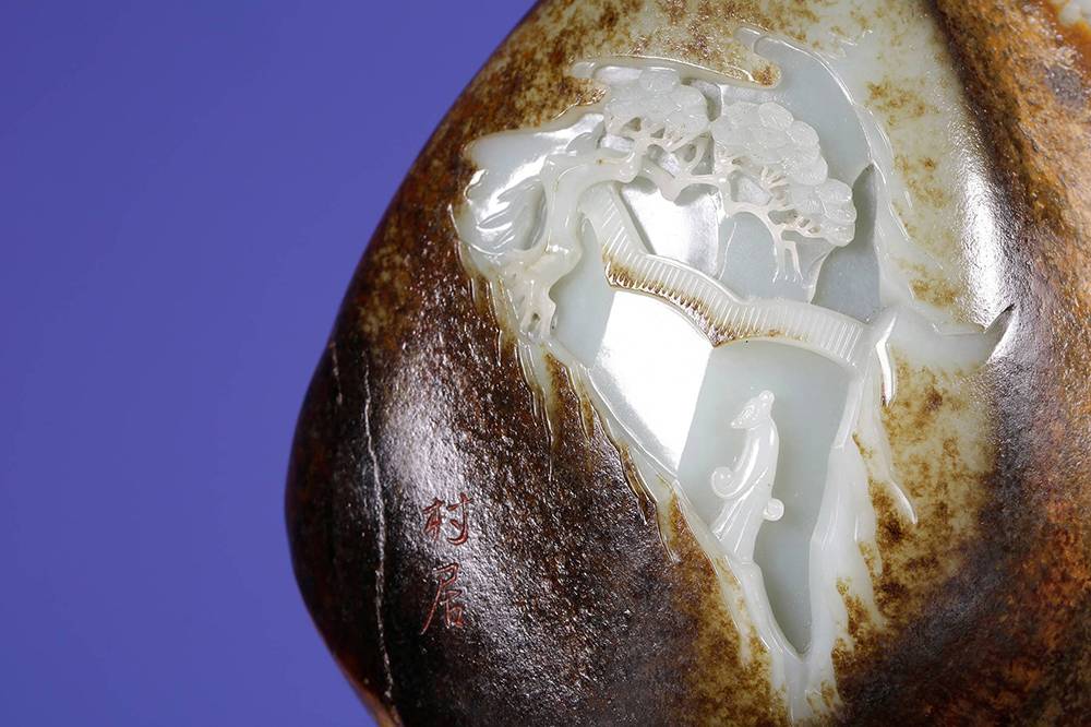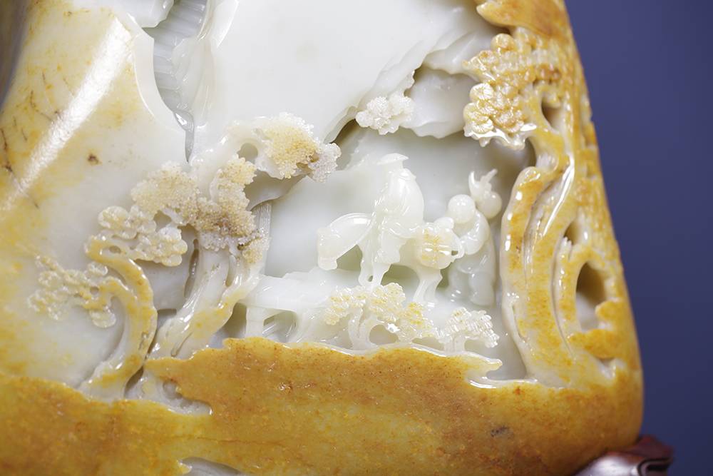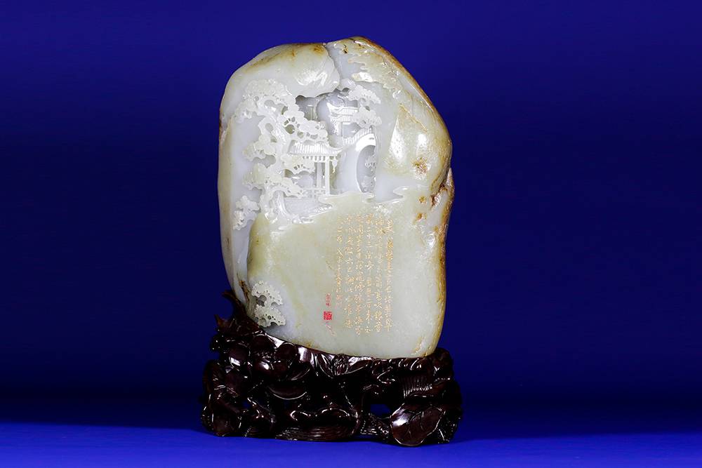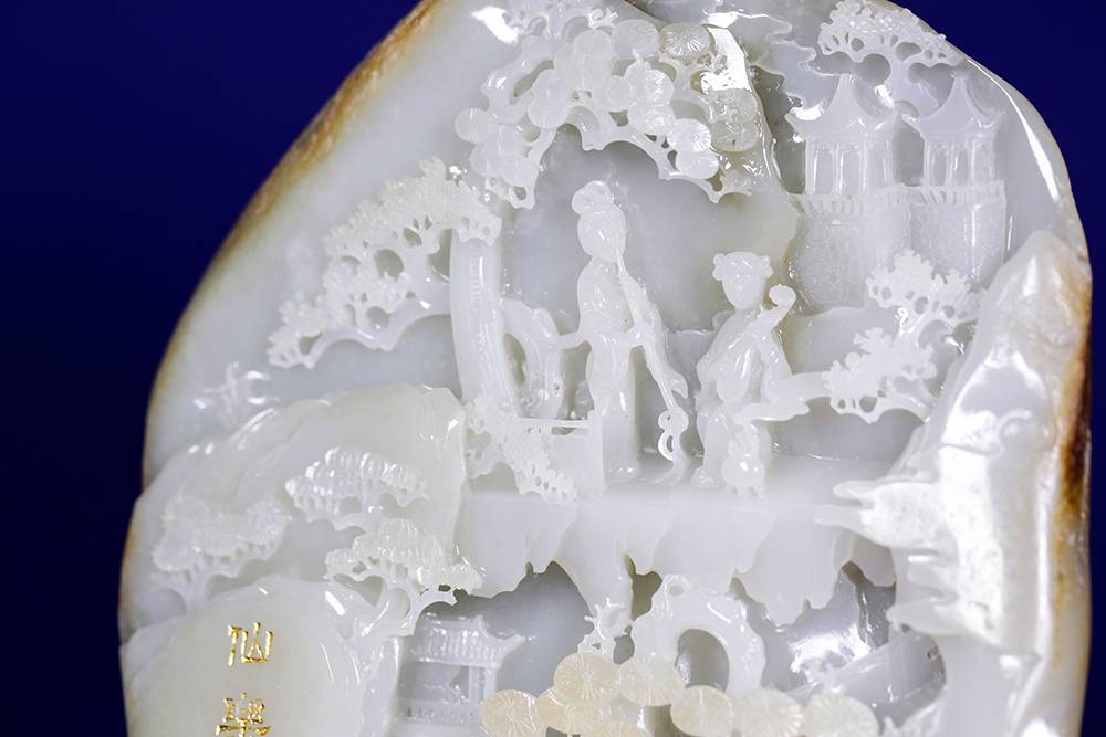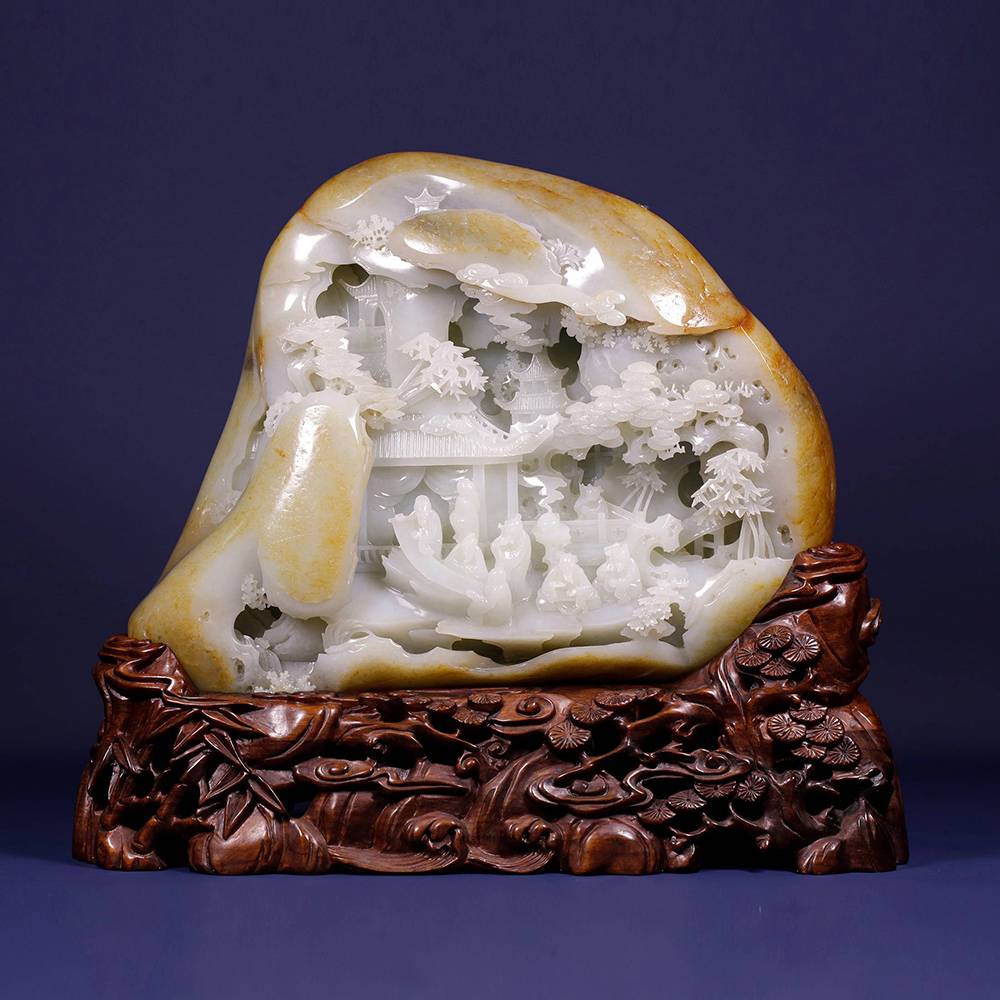 光影流转,玉中生境,一面融合浮雕、透雕等多元玉艺巧琢流云层层退远,执乐仕女在虚实之间,松下三人畅谈对饮;一面阴刻描金的诗文隐隐浮起,这三公斤的籽料,做出宋画的空濛,然仙乐无声,乐又在何处?答曰:在心耳。