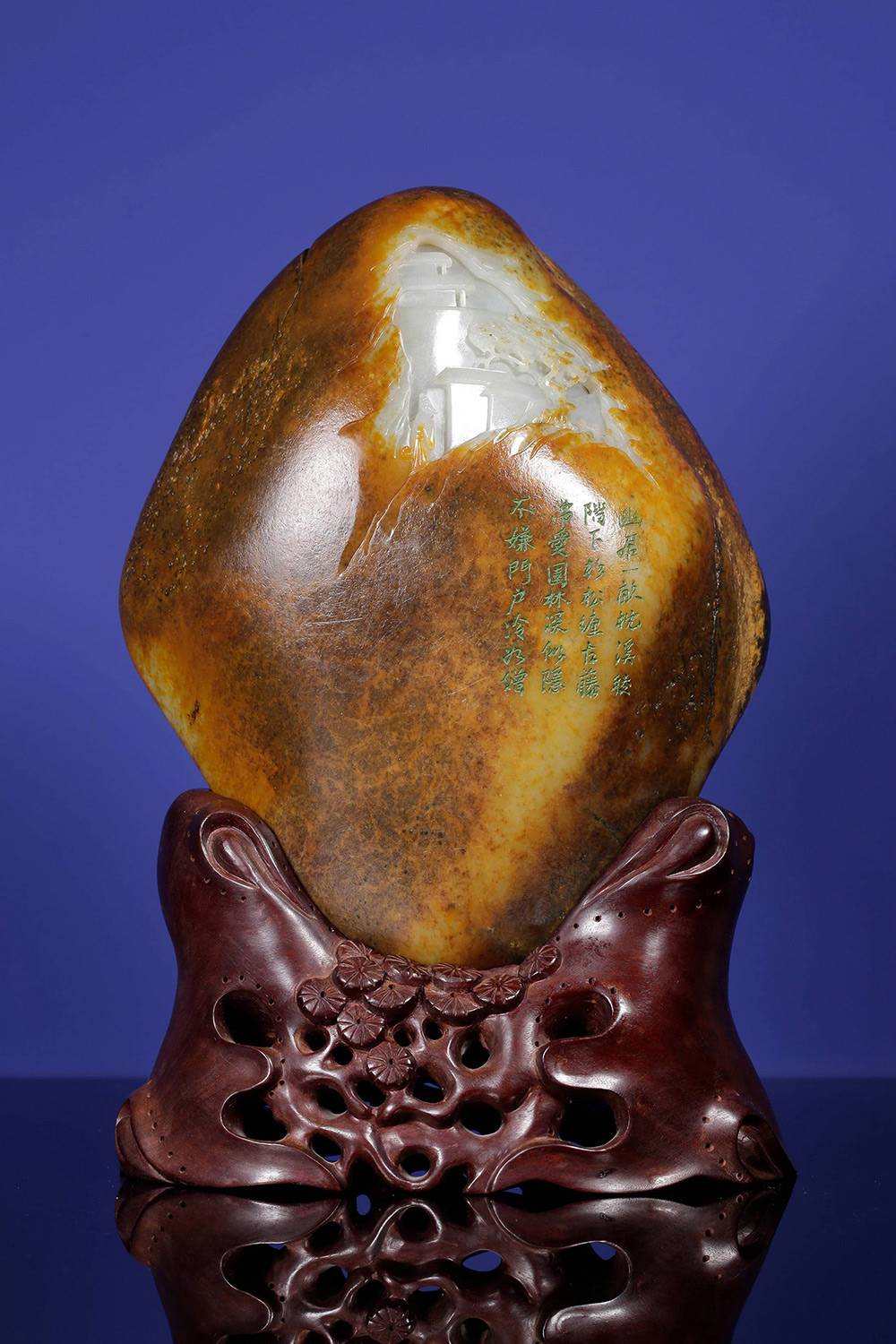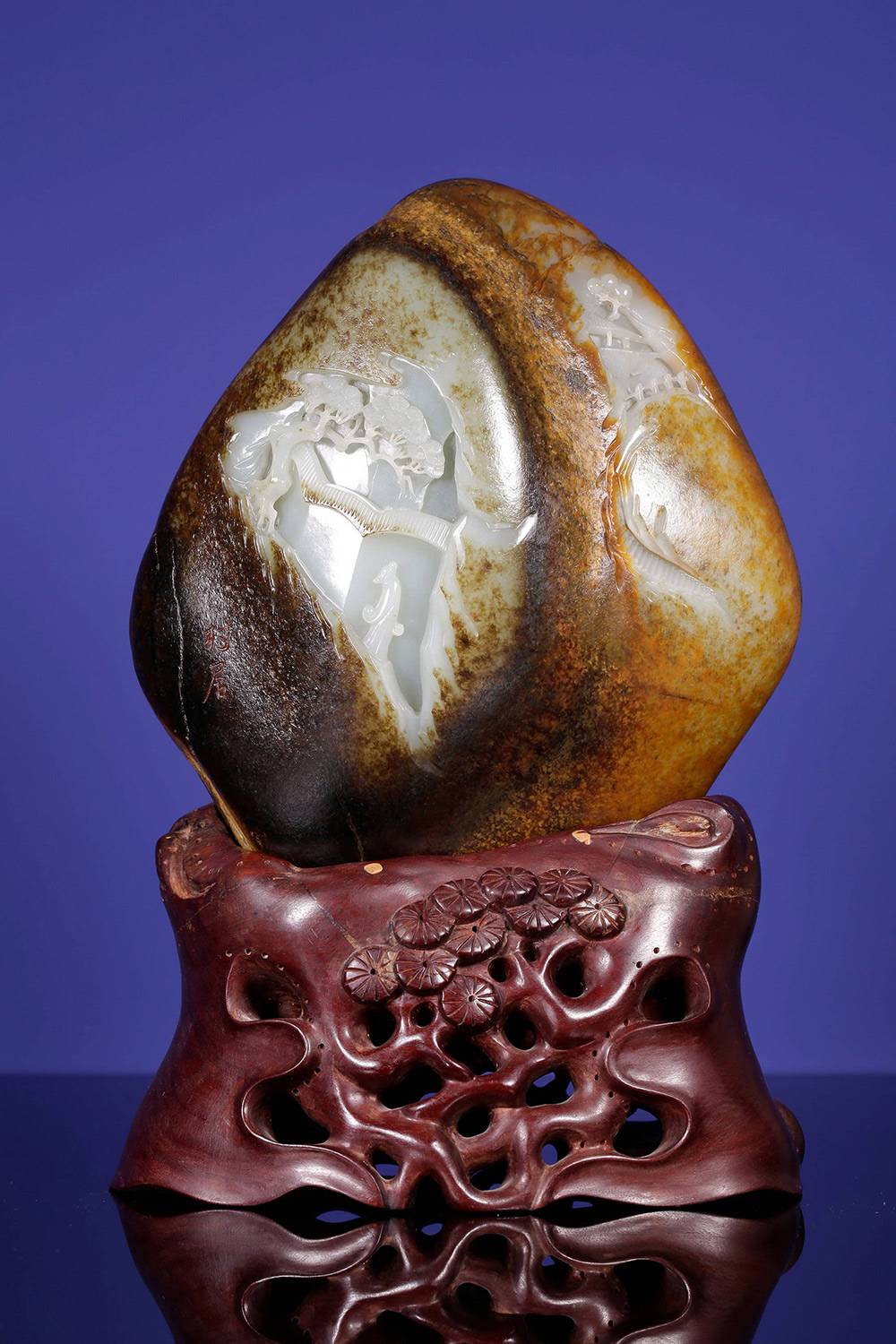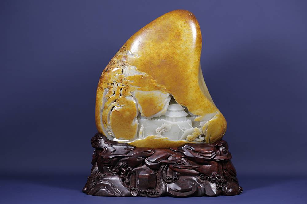 光影流转,玉中生境,一面融合浮雕、透雕等多元玉艺巧琢流云层层退远,执乐仕女在虚实之间,松下三人畅谈对饮;一面阴刻描金的诗文隐隐浮起,这三公斤的籽料,做出宋画的空濛,然仙乐无声,乐又在何处?答曰:在心耳。