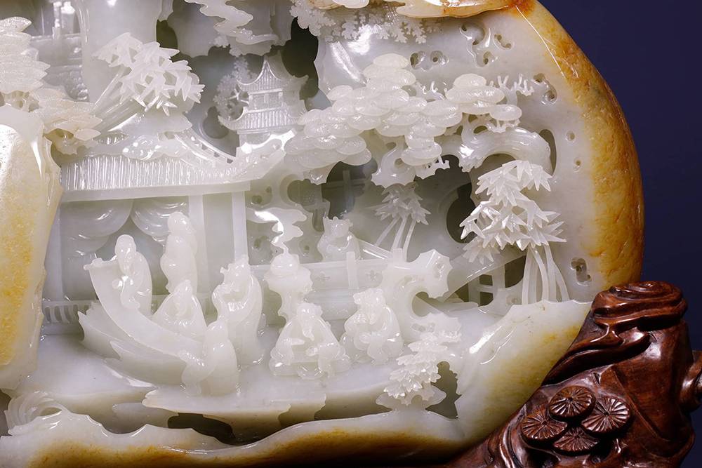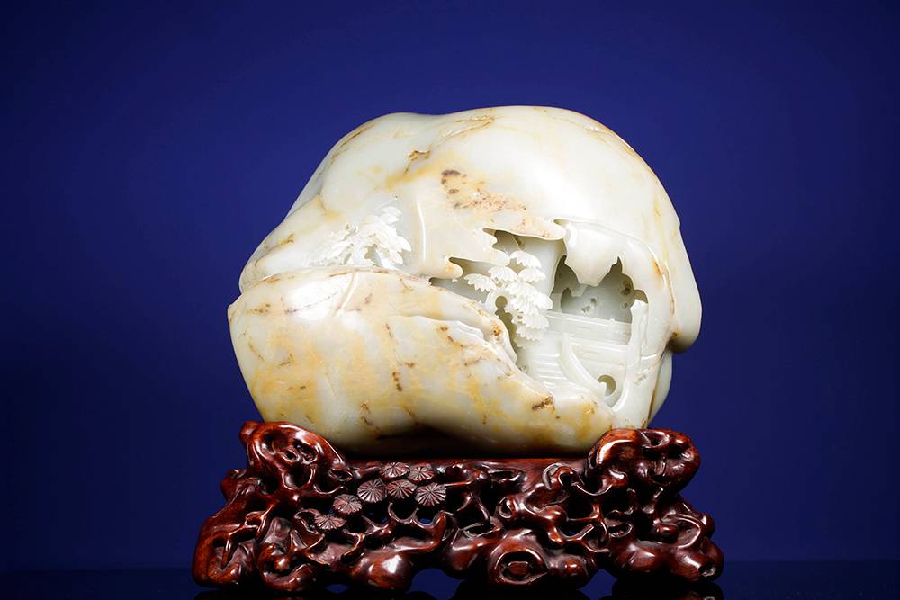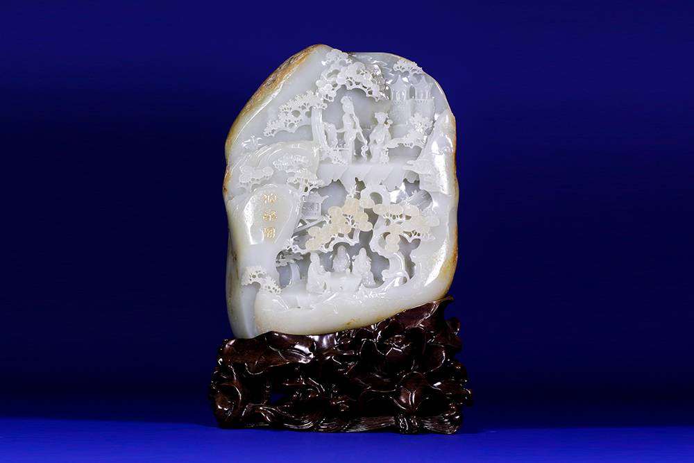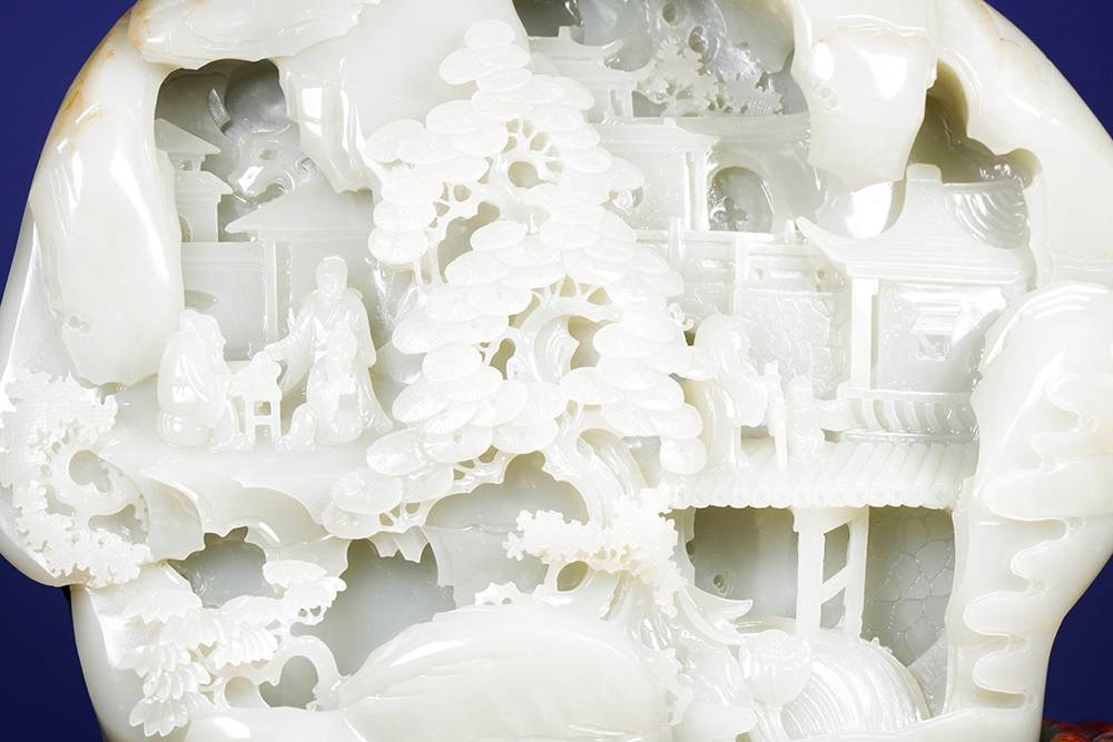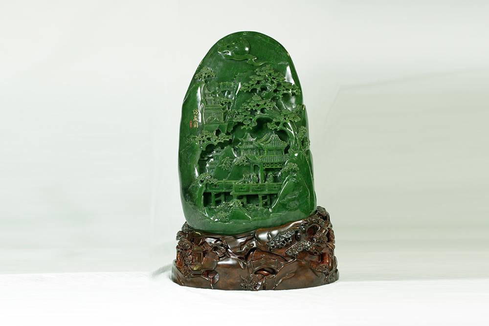 玉雕摆件,可做案头山水,亦可承心中的丘壑,方寸之间,凿得亭台数椽、松枝几茎,高士策杖,童子捧砚。初观惟润玉一帧,摩挲既久,竟闻泠泠溪声。