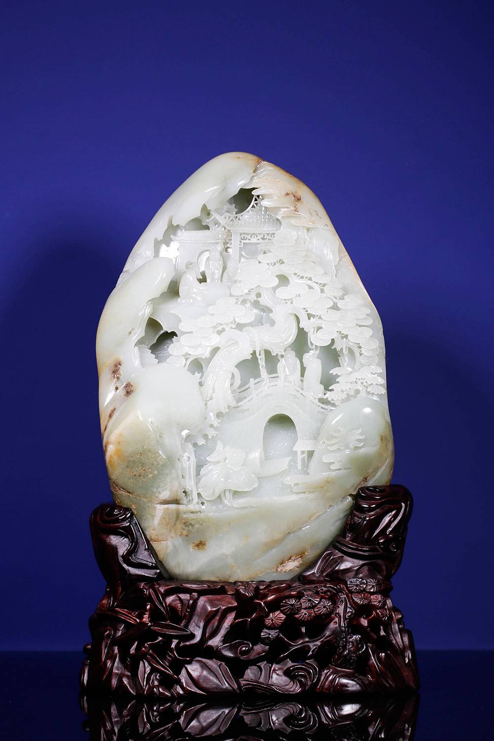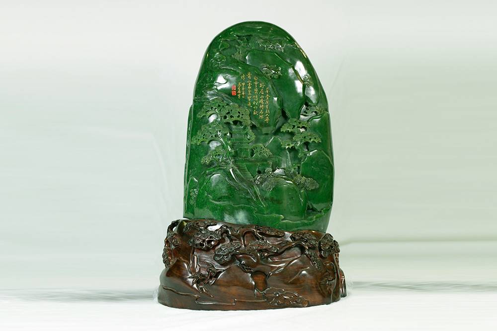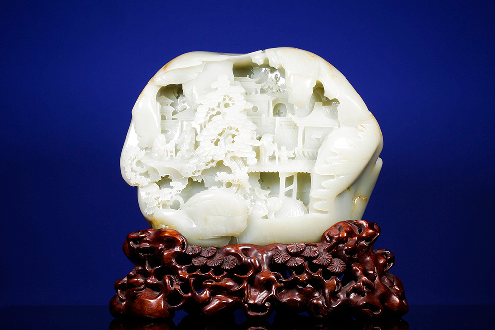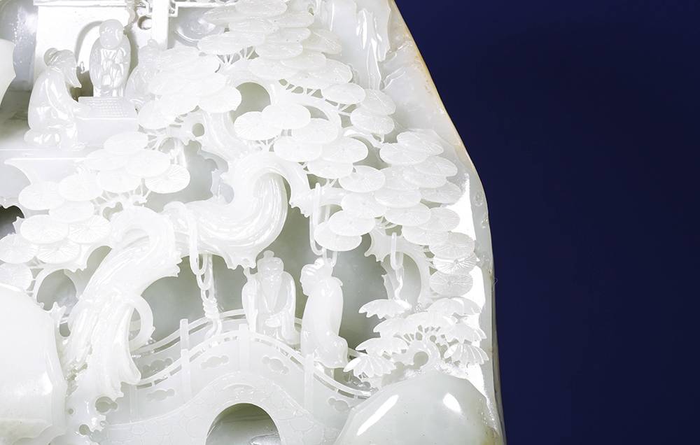 玉雕摆件,可做案头山水,亦可承心中的丘壑,方寸之间,凿得亭台数椽、松枝几茎,高士策杖,童子捧砚。初观惟润玉一帧,摩挲既久,竟闻泠泠溪声。