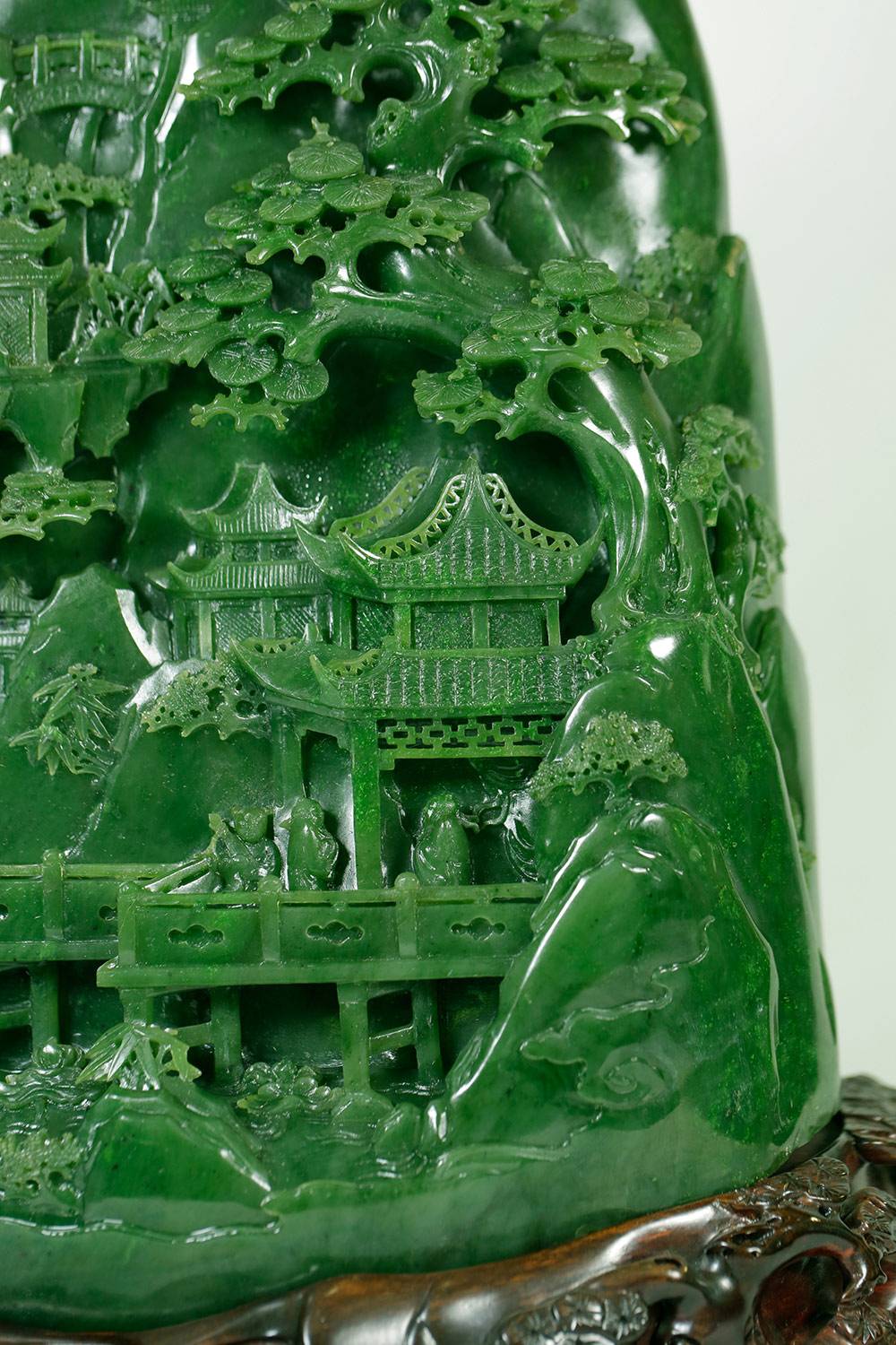 体量磅礴的碧玉山子雕,重达十四公斤,玉色沉静,玉质匀糯,融多元玉艺,顺势随形雕琢出层云出岫、亭台楼阁、松林茂密之幽境,精工细琢,在这凝缜的玉材上磨出了文人的柔软,巧作两位雅士于亭廊中相逢,书童执琴立于一旁,情景感拉满,是谓玉里访友,千年未至,而千年未迟。