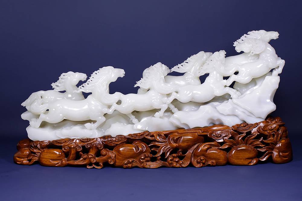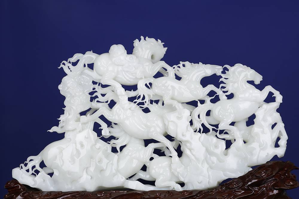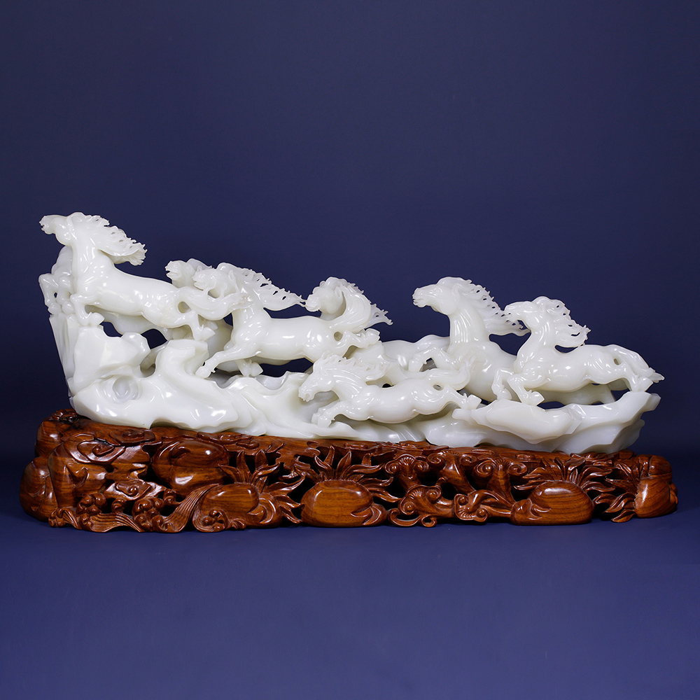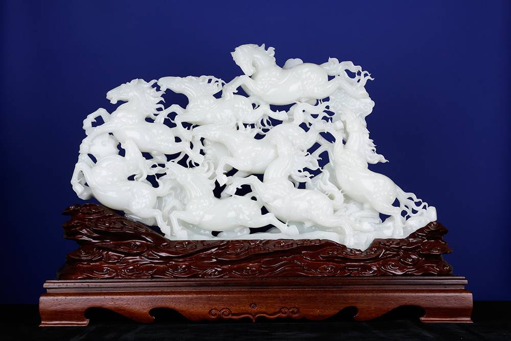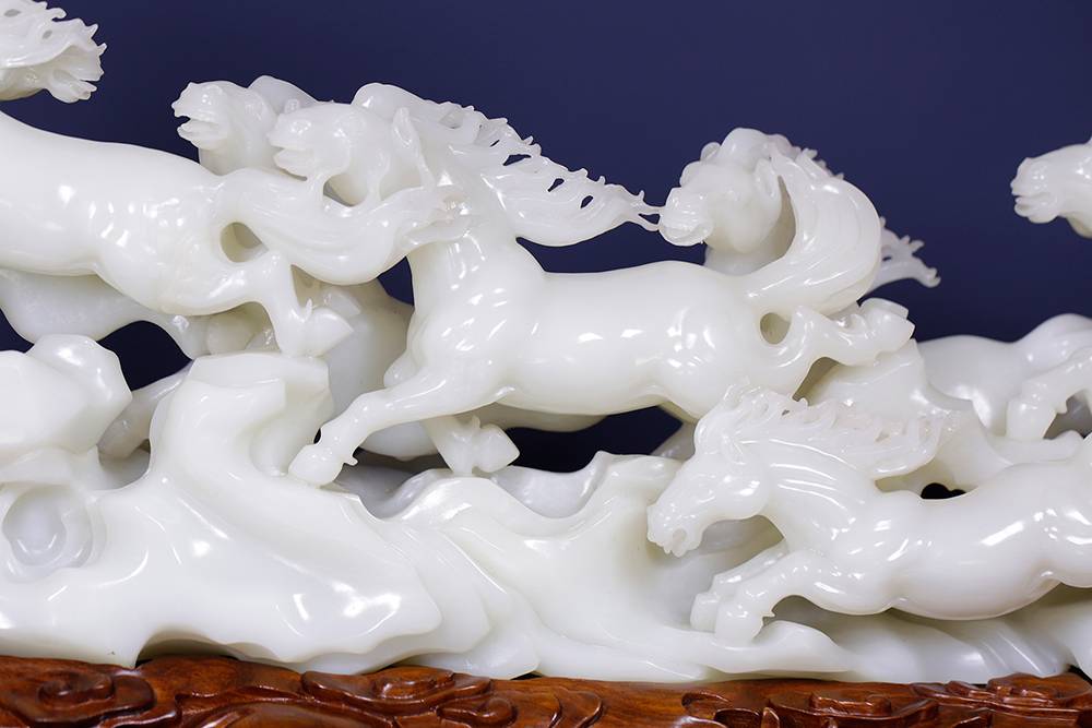 十公斤的润白玉材,雕琢出八骏驰骋的情景,分明静止,然凝神看去,这满案蹄声仿佛隐约可闻,精湛的工艺,雕的是马,亦琢出了风的形状。