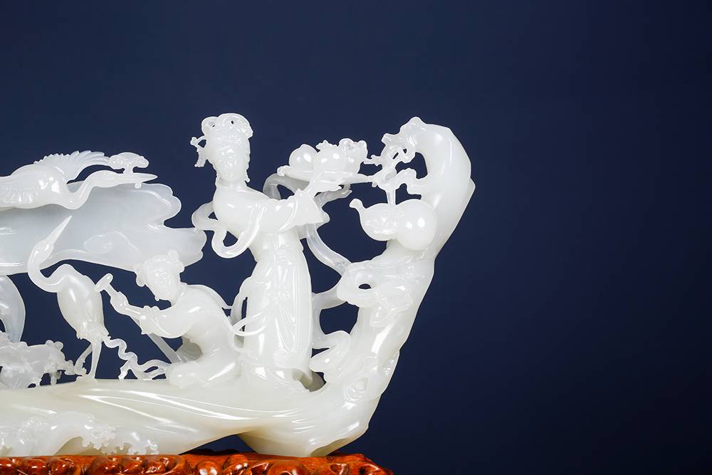 方寸之境,融合圆雕、镂空雕等多元技法巧琢“麻姑献寿”这一传统的祥瑞题材,只见麻姑衣带穿玉而出,鹤羽根根分明,童子执杖脸泛着笑意,整器疏密有致,该留白处绝不吝玉。置诸窗前,日影穿过此玉境,在地上落一片寿纹。