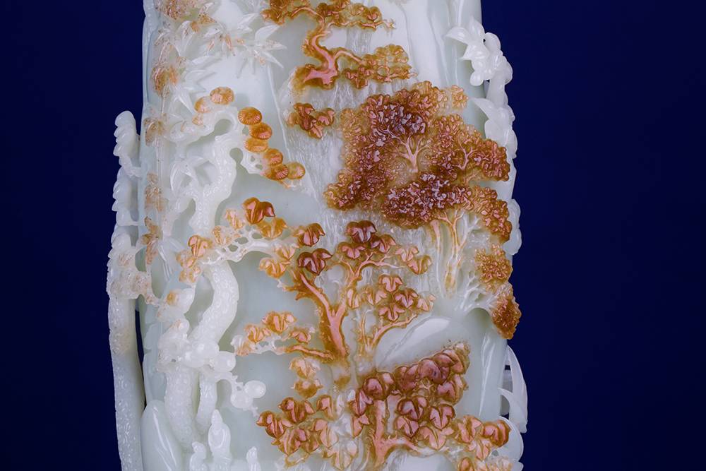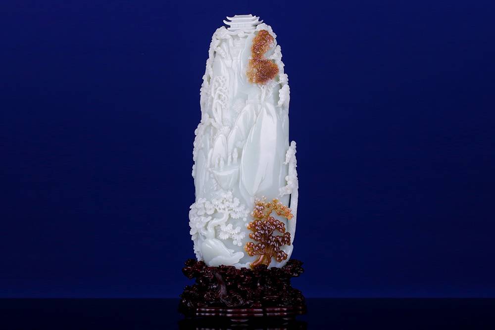 此件标王作品很是赏心悦目,初见如山子,气势磅礴;细观方知是瓶,文气内敛,玉质凝白匀糯,巧留薄糖皮色,若秋风过山麓,淡彩洇染,秋意如妆。作者融立体雕、镂雕诸法,以“平远法”构图,于瓶身展开一卷访仙长篇,方寸之间,只见山径蜿蜒,松瀑相映,人物策杖临流,步步生境。