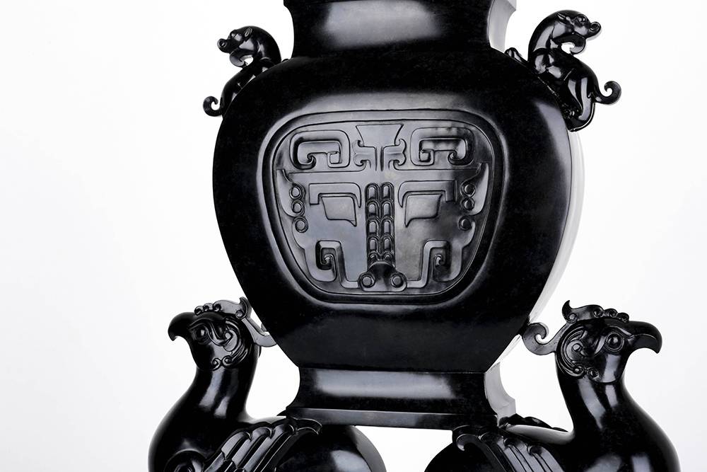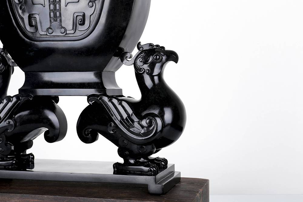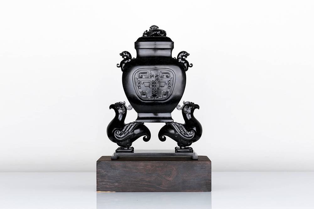 择良材琢就此件双凤座兽耳盖壶,造型古拙大雅,抚之若凝脂,温润乌亮。壶身饱满,双兽耳攀附,遒劲灵动;中间雕琢仿古饕餮纹,线条流畅,老味十足;盖钮瑞兽盘卧,神态威严。最见巧思者,乃双凤承托之底座,凤鸟昂首舒展,羽翼舒卷,以圆雕之法,令力与美相生。玉质沉穆,更衬神兽之姿。观之端庄典雅,韵致悠远,如此精工之器,可传可宝。