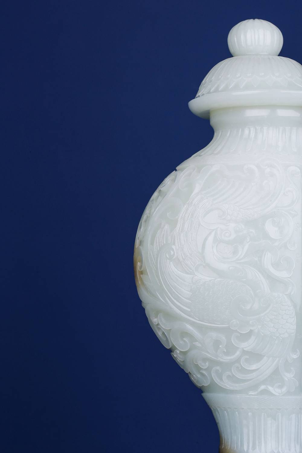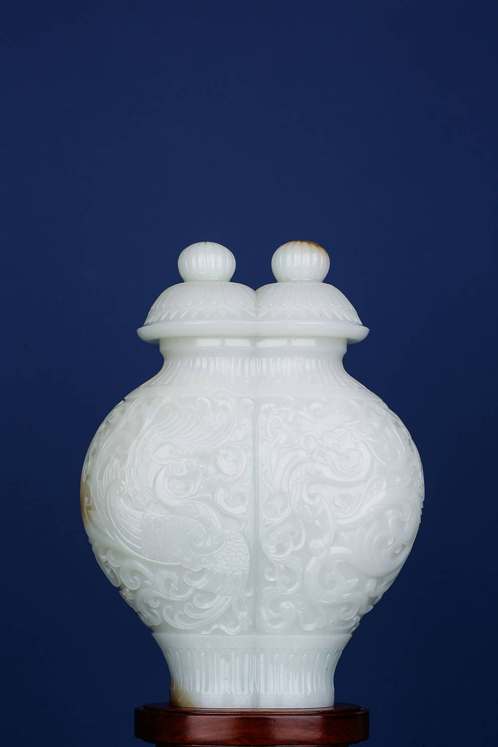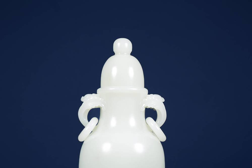 以玉质上乘的和田白玉为材,温润凝光,器循古制,线条饱满,自盖钮至圈足一气呵成。如意双耳雕琢精微,活环垂垂,可触可转,见巧思更见功力。瓶身素面无饰,以留白承载玉质之大美,简约中自生静气,作者融料、工、形、韵于一体,精工如此,可赏可藏,堪称当代玉雕雅作之典范。