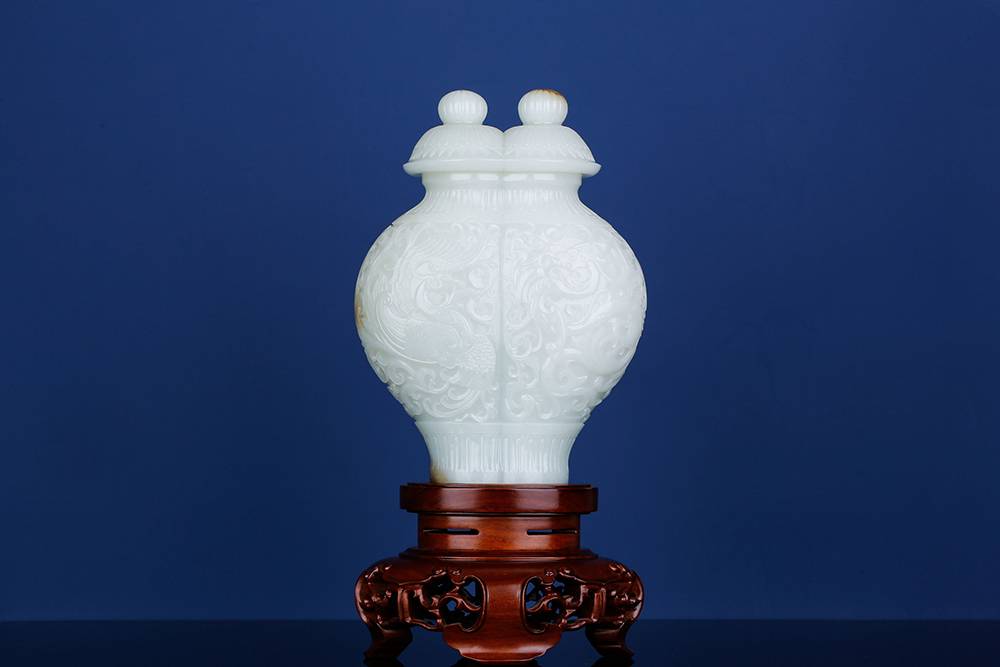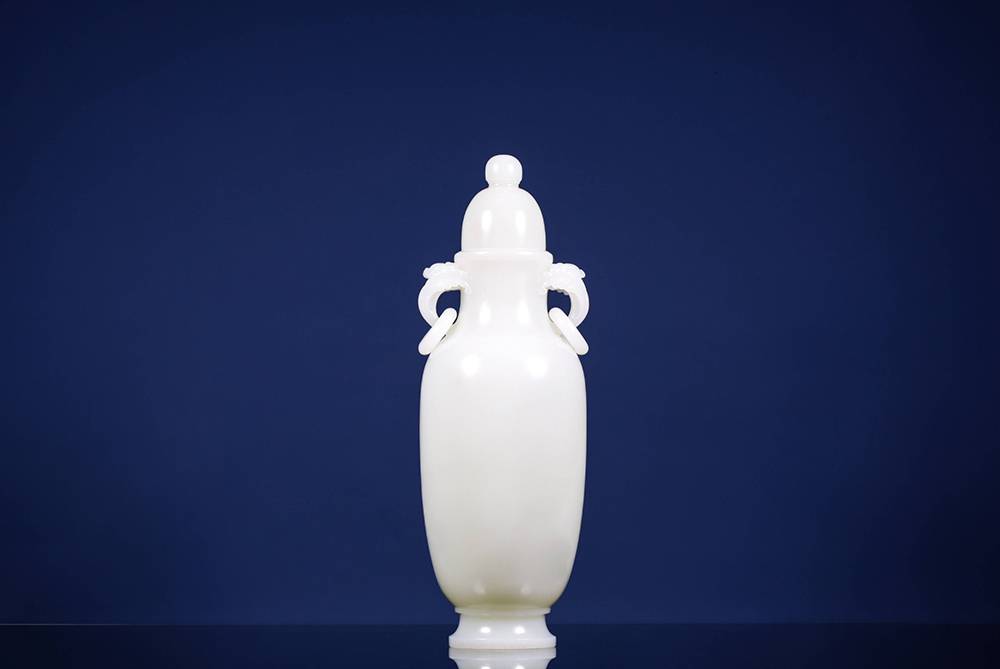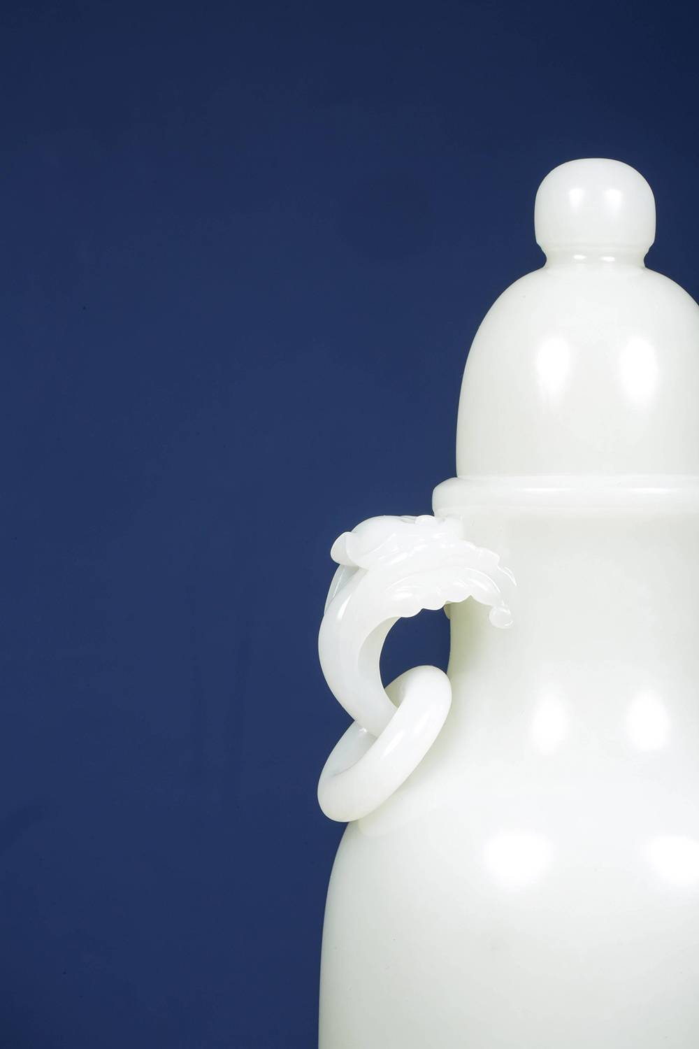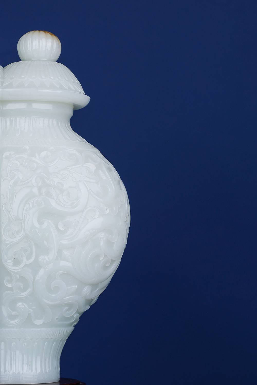 以玉质上乘的和田白玉为材,温润凝光,器循古制,线条饱满,自盖钮至圈足一气呵成。如意双耳雕琢精微,活环垂垂,可触可转,见巧思更见功力。瓶身素面无饰,以留白承载玉质之大美,简约中自生静气,作者融料、工、形、韵于一体,精工如此,可赏可藏,堪称当代玉雕雅作之典范。
