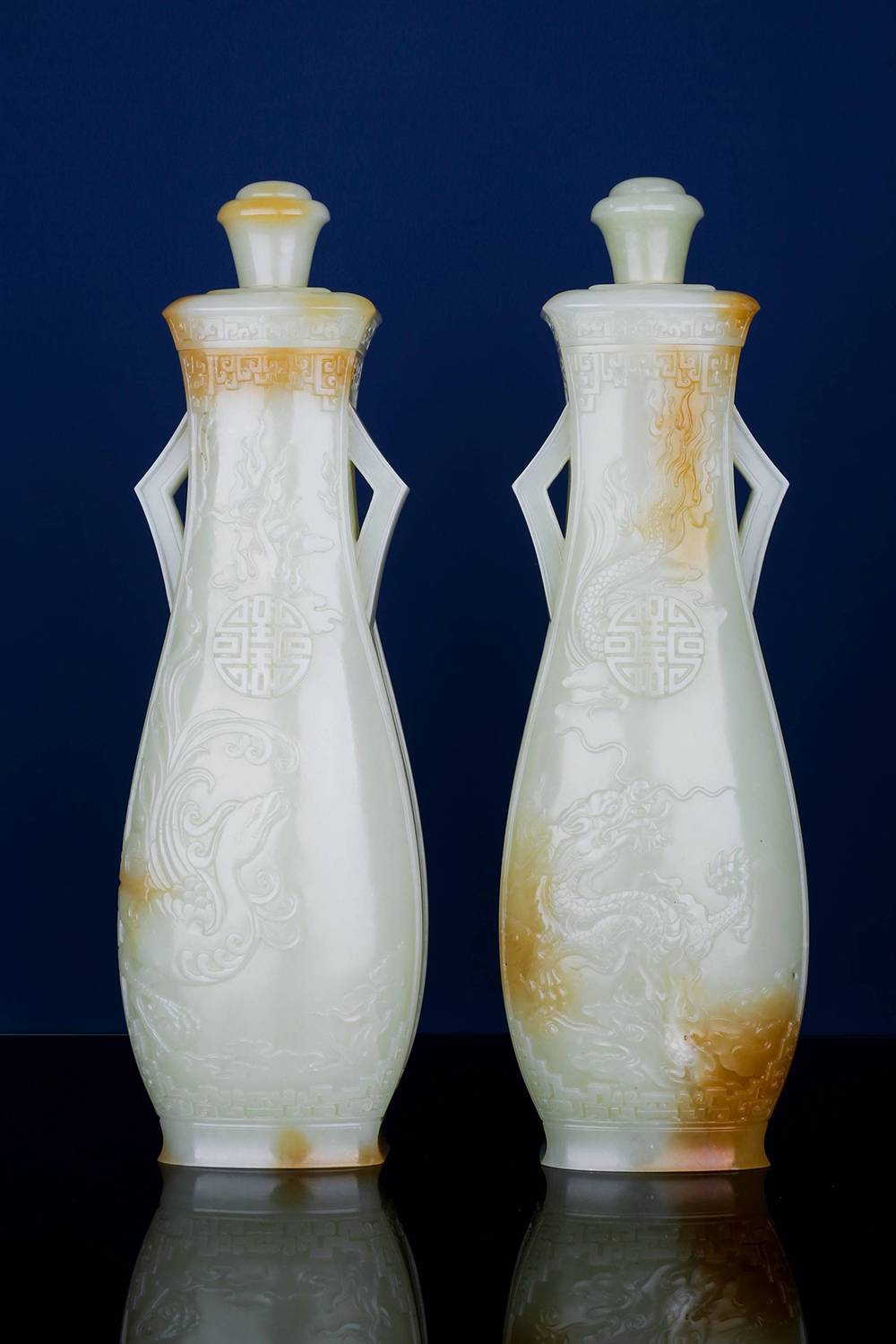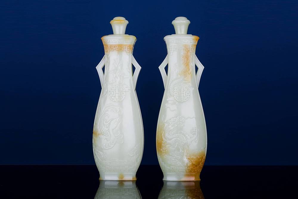 很有巧思的一件作品,双瓶联璧,吉寓自生,龙凤浮雕而出,凤姿飘逸,龙势浑厚,缠枝婉转其间,刚柔相济;瓜棱为钮,莲瓣托底,工至精微;留皮数点,素中生雅,更添古韵。观之,礼器庄重与人间祥瑞浑然一体。料佳、工精、意远,可作掌中清玩,亦堪案头长物,涵养心性,藏之可珍。