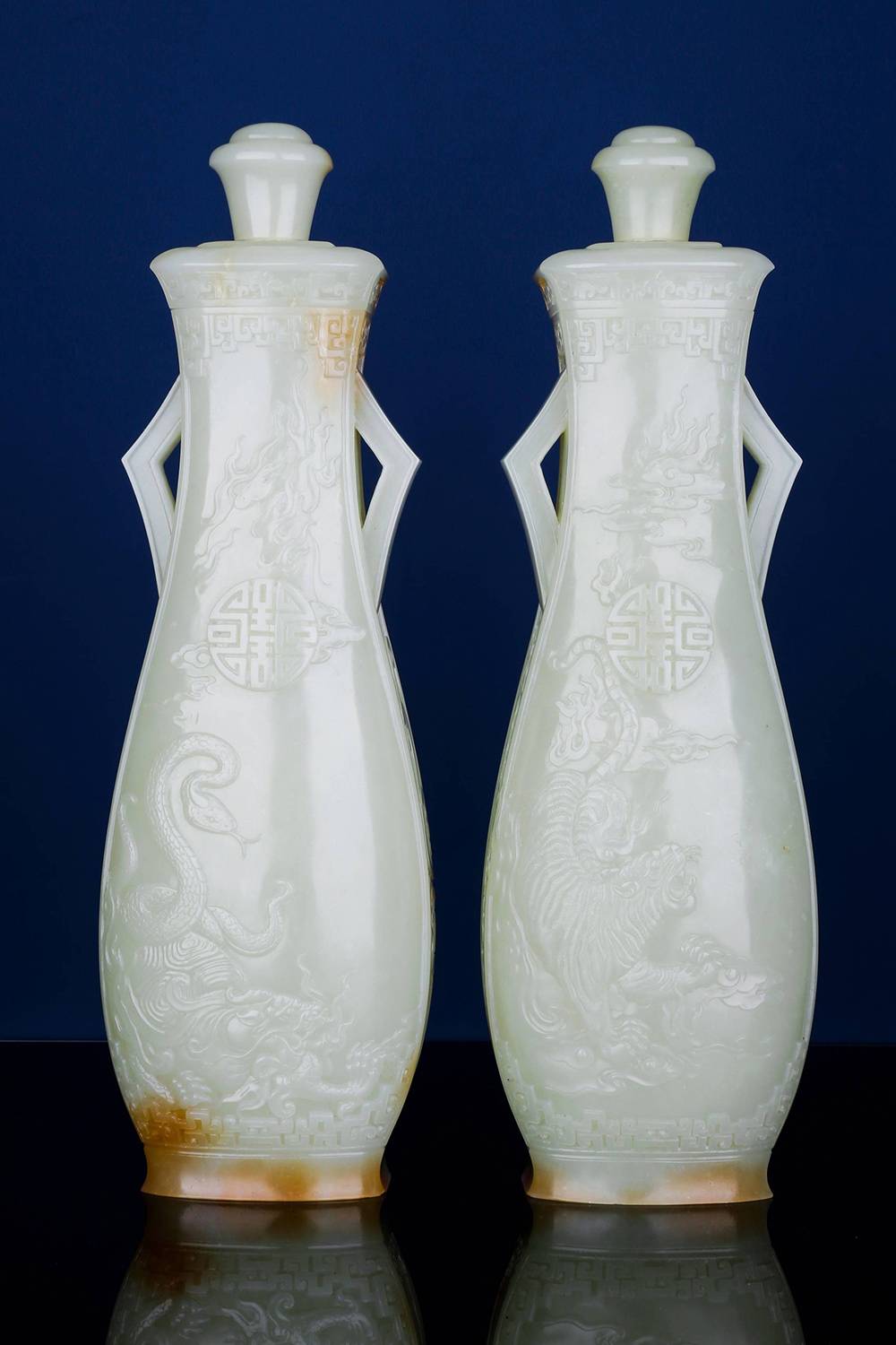 玉琢对瓶,形制统一周正,择材温润,留天然糖色,古朴韵生。静品之,只见整体线条流畅,双耳方折,颈饰回纹,端庄大气,瓶身精雕四灵神兽——青龙矫健、白虎威猛、朱雀翩跹、玄武灵动,刀法细腻,疏密有致,上古祥瑞尽显威严,中嵌团寿纹,更寓福寿绵长之吉。观之,纹饰流转间似有瑞气升腾;抚之,玉质凝润处可见匠心独运,琢玉如此,赏之悦目,藏之足贵。