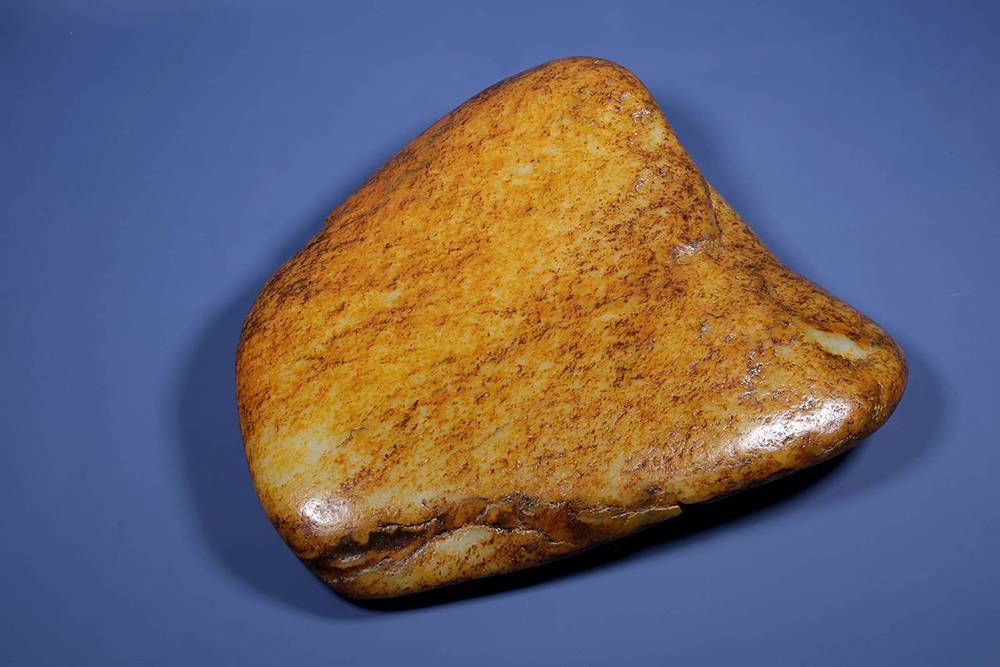 重约十一公斤的大玩料,形制规整,近尺见方,满洒红皮浑然一体。观其表,毛孔清晰自然,油润细腻,凝神细品,凝脂拙雅,宝光内含。天地造化,留此完璞,未施一刀,已然气象万千。
