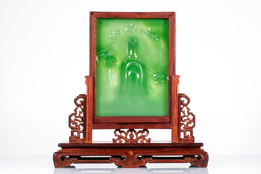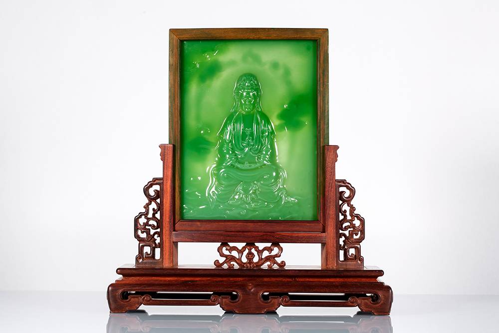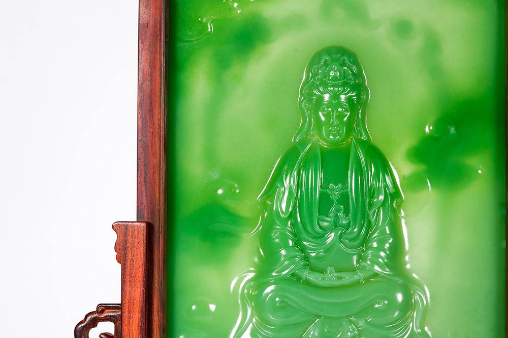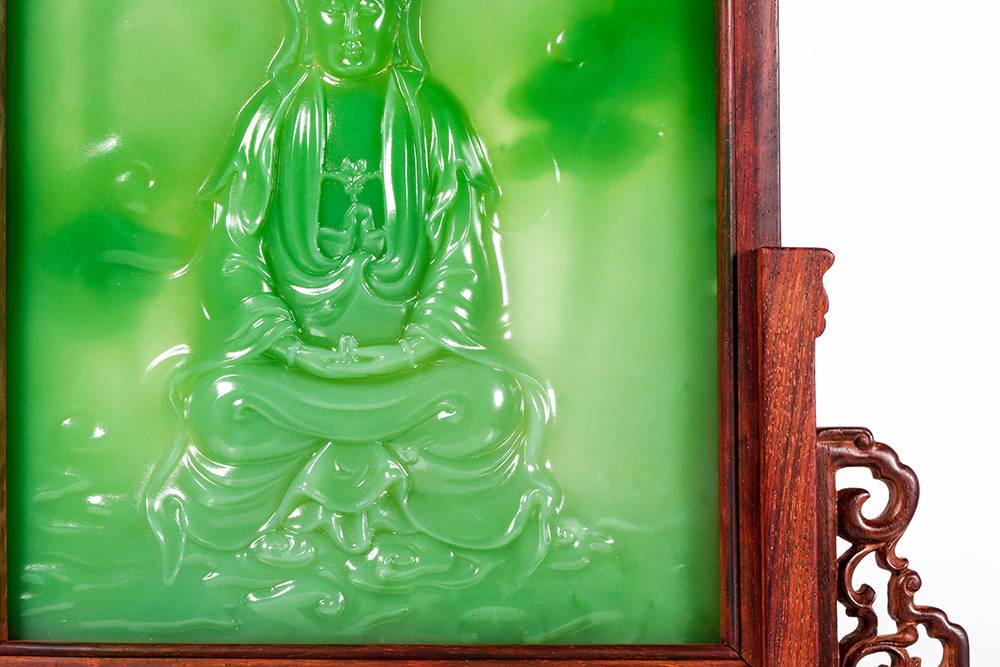 需要凝神静品的玉屏一方,正反看是两种境界:正观音端坐,碧玉的浓绿全化在了衣纹水波里,庄重得叫人屏息;翻面则是一抹浅勾的影,对着光,祥瑞融融的,很是灵动。配的深棕红木底座很妙,镂雕得很是通透,恰好托住这一汪碧色。