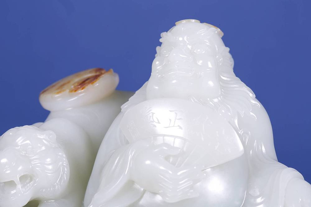 择材优渥,巧留金皮与聚黑皮,整体玉质温润,白细的玉肉衬得金皮灿然,黑皮老拙,以圆雕技艺为主,雕琢钟馗坐像,虬髯怒张,持扇镇邪,威猛中藏慈悲之韵,旁伏瑞虎昂首嘶吼,人虎相依,气势雄浑,俏色巧作山石云纹,浑然天成。