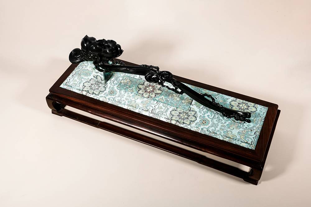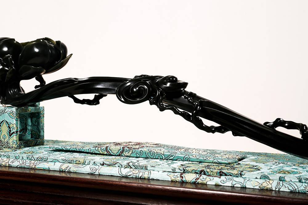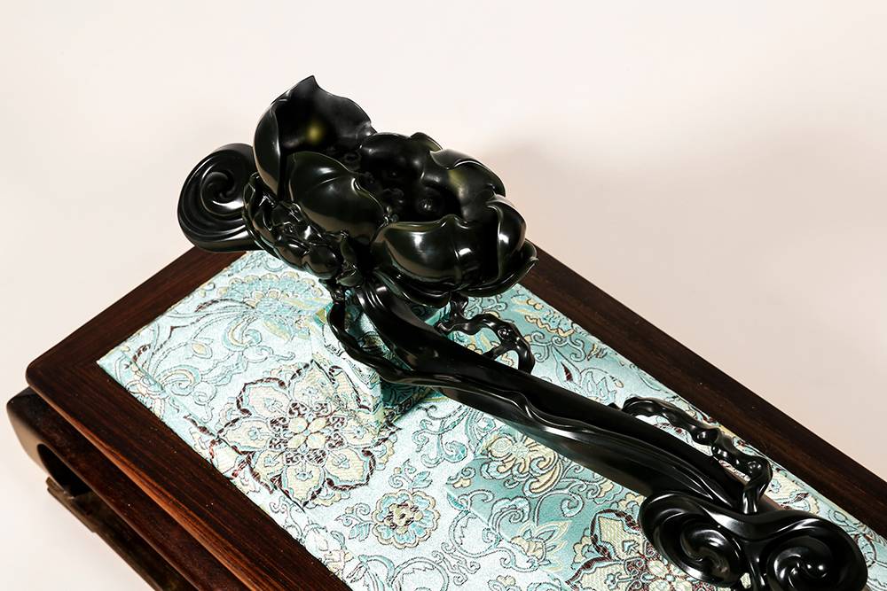 此玉雕如意循明清形制,体量雅正,质地过灯细,是谓青玉凝润,幽光暗藏,以圆雕之法巧琢荷茎舒卷,双莲并蒂,寓“和合”之吉。莲瓣柔婉,荷茎韧挺,刚柔相映,如笔意勾勒,形似如意而神在荷风。观之,玉意沉静;抚之,莲韵隽永。如此妙物,化传统祝福为掌中风雅,朝夕相对,弥觉可珍。