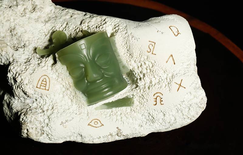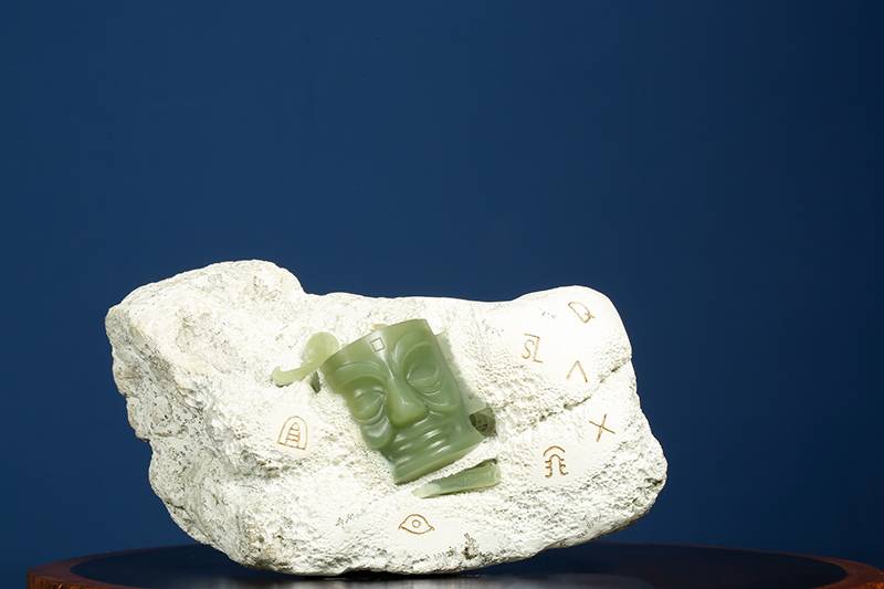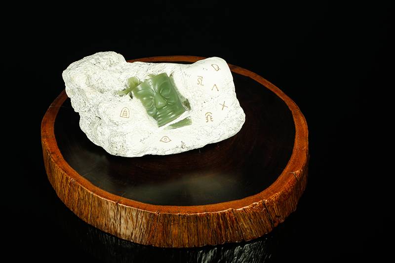 河磨料的“白包绿”,像被时间包裹的秘密,粗粝石皮巧作三星堆的土层,凝缜的玉质是青铜面具的魂,玉雕师的精工巧思让文物“破土而出”,静观其纵目、阔口、额间方印,线条如刀刻的历史亦似古蜀人凝视今天的目光。