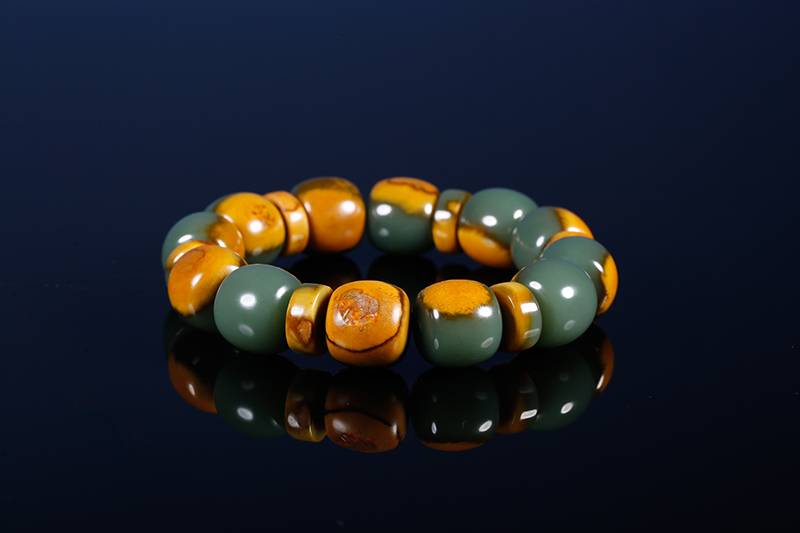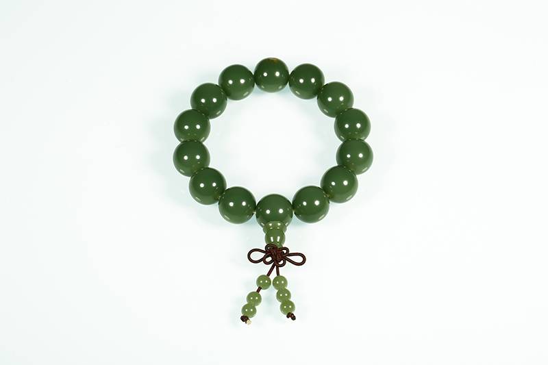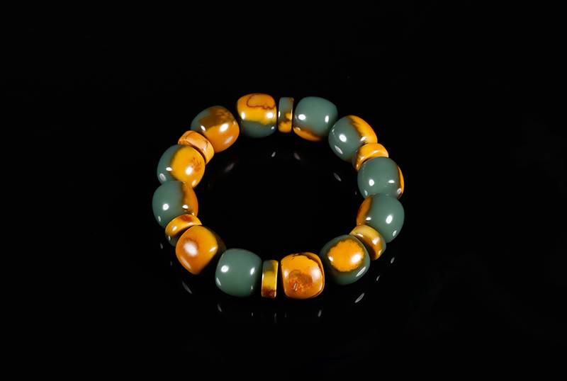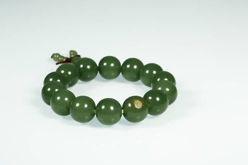 是谓良玉弗琢,没有雕饰,让玉质自己说话,此件手串,素面朝天,坦坦荡荡,黄皮配绿肉,彰显出河磨料特有的质感感,在指尖流转,像抚摸时间的包浆,也成就最朴素的佩戴,当代人用珠串对抗焦虑,而这一串,可让人触到大地深处的沉稳。