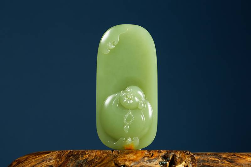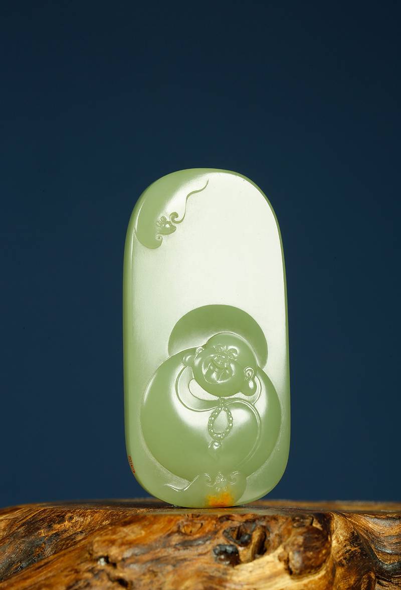 润泽的玉牌上留下一抹红皮,俏色为蝙蝠,与顶端的蝙蝠,相呼应,主体弥勒笑口常开,雕琢之间藏着苏工的克制,也撑得起“福从天降”的寓意,玉质匀净,底部天然皮色像大地留白,可收可藏,可把玩,亦可佩戴,是俗世的安慰,也是雅致的逃离。